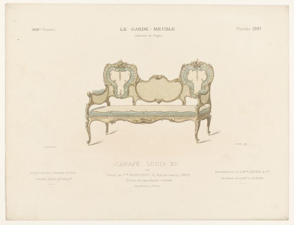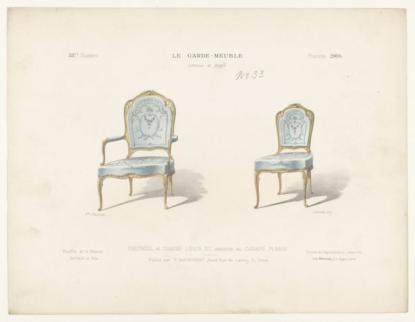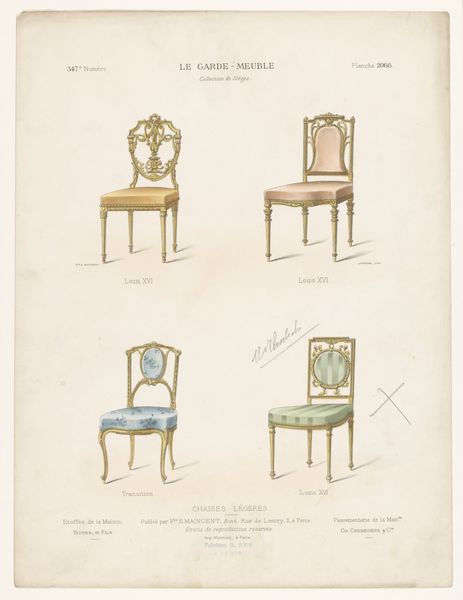 Curator: Right, let's dive in! Before us is "Drie eetkamerstoelen," or "Three Dining Room Chairs," a print made sometime between 1895 and 1935 by the artist Léon Laroche. Editor: My first impression? I'm struck by their ghostly elegance. It's like seeing the specter of luxury, faintly colored and meticulously outlined. Curator: Indeed! What strikes me is how this graphic art piece encapsulates Neoclassical aesthetics but filtered through, say, a decorative lens. It highlights not just functionality, but aspiration. The title at the top, "Le Garde-Meuble" gives it an archival or instructional feel, doesn’t it? Almost like a page from a catalogue. Editor: Absolutely! We see here the aesthetic trappings of power reproduced for potential consumers, feeding into an image of class mobility tied directly to acquiring these specific furnishings. It presents us with not just the object but the cultural and historical implications embedded in its very design. Take for instance the visual hierarchy established simply through chair style and design: each embodies something particular from that epoch. Curator: And note how the print employs line as both boundary and detail. Laroche isn't merely replicating chairs. He’s evoking Louis XV, using line and form to tap into centuries of history and craftsmanship. Editor: I would agree! It almost hints at an instructional drawing and then it turns into almost a decorative dream, promising entry into elite society, by turning the image into just an ideal form removed from tangible realities. You could argue it subtly reinforces existing social structures. Are you "royal" or ready to fake it till you make it? That question, which sounds so current, seems embedded within Laroche's almost playful arrangements. Curator: You know, I feel drawn to its slightly faded, dreamy quality even though this print could indeed function as a tool to categorize, commodify, and therefore, solidify social structures. Maybe that tension between dreamy escapism and pragmatic marketing is the most compelling aspect here. Editor: That duality makes me see it not just as an echo of historical style, but as a subtle commentary on consumerism and the allure of status, then and now.