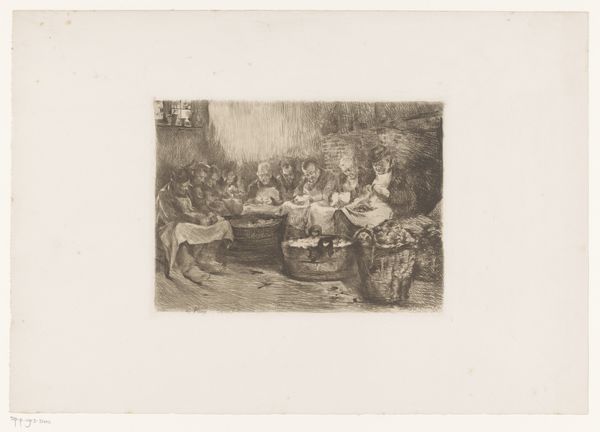 Editor: Right, so this is "Kaartspelers aan tafel," or "Card Players at the Table," by Xavier Mellery, likely created sometime between 1855 and 1913. It's an etching – so a print – and it strikes me as being very...serious? Like a moment frozen in time, heavy with unspoken tension. What do you see in this piece? Curator: I see the familiar echo of human drama. Mellery captures a simple scene – a card game – but imbues it with something more profound. Look at the detail, the textures achieved through etching, how he makes us feel the weight of their clothing, the rough grain of the table. It reminds me of old taverns, dimly lit, smoky with secrets and whispered hopes. Ever feel that sense of contained energy in those places, like a held breath? Editor: Absolutely, especially with the figure on the left. She’s not even looking at the game, just staring off. I’m wondering what she’s thinking about. Curator: Exactly! That's the beauty, isn't it? Mellery gives us fragments of lives, encourages us to fill in the gaps. Are they friends? Rivals? What's at stake? Maybe it's all just a way to pass the time. Or a window into something darker and unsaid... Editor: I hadn’t really considered that – the unspoken tensions and untold stories just below the surface. So much more than just some folks playing cards! Curator: Art is never 'just' anything, is it? It’s a portal. Mellery reminds us that even in the mundane, the human spirit is a restless sea of possibilities. Editor: That’s beautifully put, really. This piece definitely has more depth now, thinking about it like that. Thanks for sharing your insights.