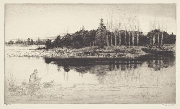 Editor: Stow Wengenroth's "Lonely River," a print from 1953, offers a beautifully detailed landscape. The scene feels so still and almost dreamlike to me. What strikes you most about this piece? Curator: What I find compelling is how this seemingly simple landscape participates in the tradition of American landscape painting, yet departs from it. The title itself, "Lonely River," signals a shift. Unlike the expansive vistas of the Hudson River School celebrating Manifest Destiny, Wengenroth offers a more intimate, even melancholic view of nature. It mirrors a postwar sentiment, perhaps a turning away from grand narratives. Does the level of detail alter how we relate to landscape painting conventions? Editor: That's fascinating. I hadn’t considered the historical context beyond the aesthetic beauty. So, the "loneliness" hints at a broader societal feeling? Curator: Exactly. The piece presents a distilled image of nature. The careful rendering of light and shadow, alongside its almost photographic precision, evokes both realism and something bordering on the surreal. We need to consider Wengenroth's artistic choices – like limiting the palette and embracing the print medium. These were all decisions that affected how people experienced American landscapes, often flattening nature in a time where they yearned for the real. Editor: I see. By using printmaking and focusing on detail, Wengenroth offers a different experience from grand landscape painting, prompting contemplation, maybe even sadness? Curator: Precisely. It encourages reflection on our relationship with the land and questions celebratory historical interpretations. It's an image for a changed America, looking for new ways to see itself. Editor: Thanks. I see so many layers here that I hadn’t noticed before. Curator: Landscape painting becomes much more potent when situated within broader historical currents. I think that you are going to look at landscape in art differently from now on.