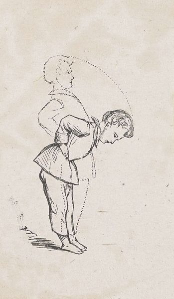François-Claudius Compte-Calix created this study of a standing man knocking, with a sketch of a sitting man, using graphite and heightened with white chalk on blue paper. The way the artist has worked with these materials speaks to a particular moment in art history. The texture of the paper, combined with the layering of graphite and chalk, gives the sketch a hazy, dreamlike quality. You can almost feel the artist experimenting with shading and form, using the qualities of these modest materials to capture the essence of the figures. What is most interesting is how such a quick sketch seems to capture a moment in time, when the traditional distinctions between formal portraiture and everyday life were starting to blur. The immediacy of the medium contributes to this effect, giving it a sense of spontaneity and authenticity. This drawing shows us how even the simplest of materials can be used to create art that is both technically impressive and deeply evocative, offering a glimpse into the social and cultural landscape of its time.