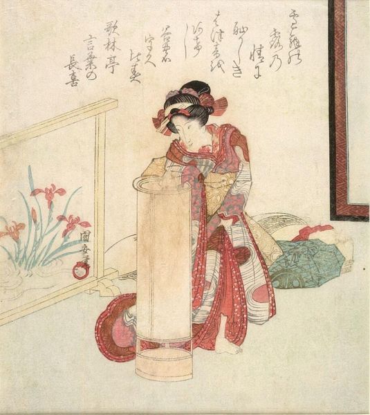 Curator: Kitagawa Utamaro's woodblock print, "Courtesan Nakagawa of the Matsubaya," from the Late Edo period, captures a moment of quiet introspection. My first impression? Melancholy elegance. The delicate lines and muted palette evoke a sense of longing, almost a sigh on paper. Editor: It's fascinating how Utamaro uses feathers—both as a decorative motif and a writing tool—to represent Nakagawa's world. Feathers symbolize both flight and fragility, freedom and confinement. It really speaks to the duality of her existence as a courtesan. Curator: Exactly! And the way she’s so engrossed in her writing, it's like we're intruding on a very private moment, maybe a secret longing expressed through carefully chosen words. I wonder what she’s writing? Perhaps a love letter, or maybe just a grocery list! Editor: Don’t you think the composition mimics classical Buddhist art with the lotus pedestal table echoing the classical lotus throne. Curator: That's a fascinating reading! I wonder what the artist would have to say about that! Editor: So true! It is such a sensitive and thought-provoking piece, that invites you into another world. Curator: It’s an image that resonates across centuries.