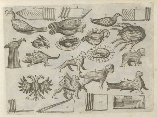Curator: Look at this delicate display—a print from 1692 entitled "Tien affuiten en ornamenten voor geweren," or "Ten Gun Carriages and Ornaments for Guns," created by Pieter Schenk. The fine lines of the etching and engraving really pop. Editor: It feels like looking into a jeweler’s sketchbook! Delicate, but also hinting at power and destruction, adorned with these baroque flourishes... It’s quite a contrast. Curator: Schenk was known for his engravings and prints. This particular piece showcases his skill in rendering incredibly detailed designs for gun ornamentation. It’s a functional design study, yes, but elevated by the era's artistic sensibilities. Editor: Seeing cupids frolicking alongside depictions of warfare feels so wonderfully odd. You have these symbols of innocence paired with the stark realities of conflict. Almost like a bittersweet poem etched onto steel. Curator: Precisely. And consider the figures riding mythical creatures along the barrel—the symbolic weight they carry. We can also see floral motifs, shells and classical figures. These weapons aren’t just functional items; they're status symbols laden with meaning. Each image conveys messages of power, skill and perhaps a little vanity. Editor: Thinking about these ornate guns in the hands of people… it’s an incredible demonstration of cultural values reflected even in tools of war. Each element—the cherubs, the beasts—echoes not just artistic trends, but the human need to infuse even destructive objects with beauty. Curator: In viewing this work, it becomes clearer that even the most brutal elements can carry with them complex tales of artistic expression, craftsmanship, and cultural attitude. Schenk has offered a tiny, but telling glimpse of a very particular sensibility. Editor: Yes, from a time when death could arrive beautifully packaged. An arresting, beautiful artifact offering a grim perspective of its moment, but viewed through an artist's keen eyes.