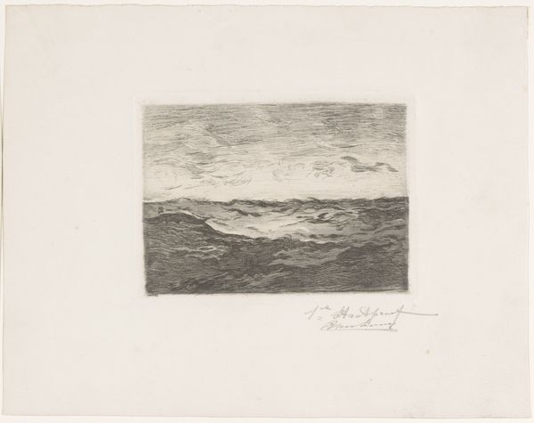 Editor: So, here we have Anders Zorn's "At Folkstone" from 1890, an etching on paper. It's quite small and simple. There's a strong horizontal emphasis with dark, scratchy lines in the foreground fading to the hazy background. It feels lonely, almost melancholic. What stands out to you about this piece? Curator: Oh, melancholy, absolutely! It whispers, doesn't it? Zorn’s etchings, though seemingly simple, are steeped in the emotional landscape. The bleakness isn't just in the scene, but also in the *implication* of absence. What's *not* there becomes a vital part of the story. Tell me, what feelings do you experience standing, say, on such a beach, knowing that *horizon* keeps its distance? Editor: That's beautiful! I think it's that distance. It evokes a feeling of being stuck in a liminal space, of waiting, or longing for something just beyond reach. But I find myself wishing he'd included a figure – some indication of human presence to relate to. Curator: Ah, but is that figure truly absent? Consider how we, as viewers, *become* that solitary figure. Zorn cleverly turns the tables, doesn't he? It is up to us to breathe our existence into the landscape, to populate it with our yearnings. Are the waves then not footsteps? The sand, the wrinkles on our brows? We bring the story to the stark beach. What about the time do you imagine at this shore? Editor: Oh, I see! I love that idea of becoming the figure in the landscape. And I hadn’t thought about the time. It feels like dusk, that in-between time where the day is fading but not quite gone, and all colors become shadows... Thank you for pointing that out! Curator: My pleasure entirely! These pieces teach us, after all, to bring our own sunset to them, as you so eloquently have! Editor: It has certainly deepened my understanding – art is a conversation, not just an observation, and in this one I learn that absences have something important to say!