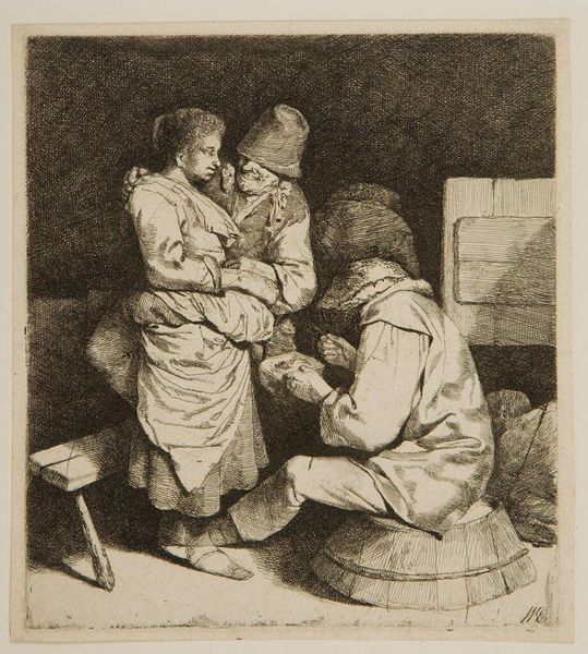 Cornelis Bega created this etching, The Young Innkeeper, in the middle of the 17th century. The print invites us into the lively, yet morally ambiguous world of a Dutch tavern, a space where social classes met, and gender roles were often challenged. We see a young woman, presumably the innkeeper, caught in an embrace with an older man. This interaction, set against the backdrop of another man counting coins, hints at the economic and sexual exchanges that characterized such establishments. The woman's expression, though, seems to convey a sense of resignation or discomfort, offering a glimpse into the complex power dynamics at play. Bega, like many of his contemporaries, was interested in depicting everyday life, yet he often infused his scenes with a critical eye. The viewer is left to consider the ethical implications of this social environment, inviting reflection on themes of youth, exploitation, and the negotiation of identity within the confines of 17th-century Dutch society.