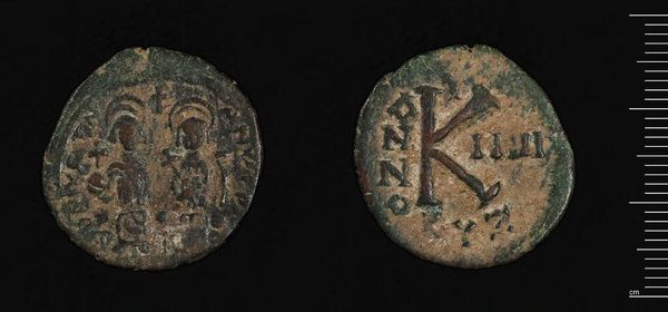 Curator: This is a half follis coin of Anastasios I, ruler of the Byzantine Empire from 491 to 518 AD. It's an artifact that speaks volumes about the politics and economics of the time. Editor: There's a somber, weighty feel to it, isn’t there? The copper is weathered, marked by time. I’m struck by the image of the Emperor on one side and a large "K" with a cross above it on the other. Curator: The "K" represents 20 nummi, a denomination of Byzantine currency. It reflects Anastasios's monetary reforms to address corruption and stabilize the empire's finances. Editor: So it's not just a pretty face—literally!—but a symbol of systemic change. I wonder how this reform impacted the everyday lives and social mobility of those under his rule. Curator: Coins like this were critical tools for communicating the emperor’s image and projecting power throughout the vast Byzantine territories. Editor: Reflecting on this coin, I see a tangible link to complex economic and social forces of the era. Curator: Exactly, and that's what makes it such a compelling artifact for understanding that period.
