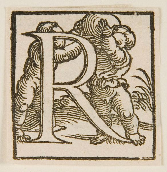 Editor: Here we have an intriguing woodcut initial, the Letter R, by an anonymous artist. I'm struck by the presence of Death within the letterform. What do you make of this image? Curator: The danse macabre motif was a common memento mori symbol. It's fascinating to see Death integrated so directly into the alphabet, a cornerstone of culture. What continuity do you see between past and present? Editor: I guess reminders of mortality were more explicit then. Curator: Indeed. Notice how the skeleton interacts with tools. Those were signs of labor and also agriculture, which has a connotation to nature, and to time. Are these symbols still effective today? Editor: I think the raw image of death always gets our attention. I learned how symbols change over time. Curator: And how they reflect our shared human anxieties.