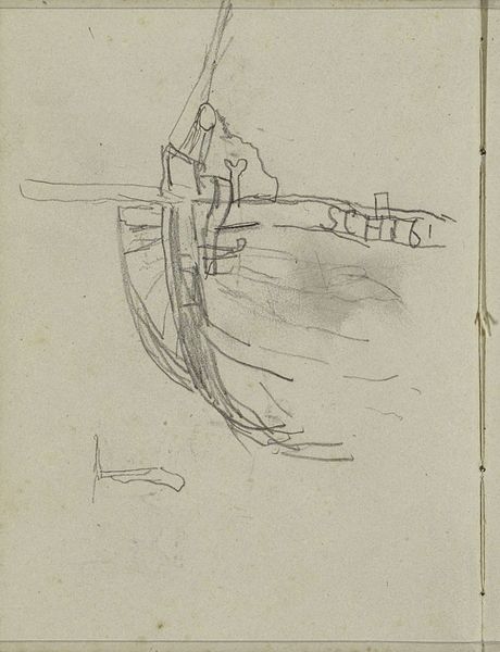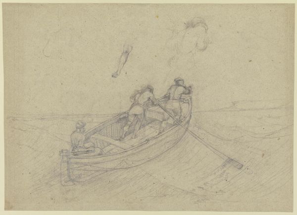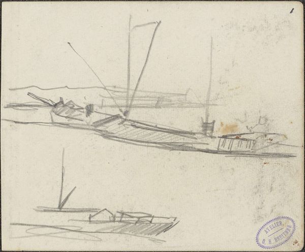 Curator: My eye is immediately drawn to the ethereal quality, the almost dreamlike state it evokes. Editor: Well, that's fitting, I suppose, considering we're looking at Agnes Slott-Møller's "Woman in a Sailboat" from around 1897-98. It’s currently held at the SMK, the National Gallery of Denmark. This pencil drawing exemplifies the Romantic spirit so prevalent at the time. Curator: The boat seems less a mode of transport, more a symbol, a vessel for the soul perhaps, carrying her away into the unknown. The figure, barely defined, is subsumed into the sails, becoming one with the journey. Editor: It’s fascinating how Slott-Møller captures the mood of the period, reflecting the growing Symbolist movement which, after all, reacted to the industrial revolution and changing social norms with, among other themes, myth and dreamscapes. One must consider how her position as a female artist influenced the representation here too. Were such voyages and freedoms available to women at the time, both literally and figuratively? Curator: Absolutely. The wind-filled sails contrast with the barely sketched landscape; her back is facing us. Is it uncertainty or determined resolution, as if embracing change? Note how that wind seems to direct the composition. A liminal space then. Editor: The roughness of the pencil marks too suggests haste, not a formal portrait, a feeling which in itself marks it as modern for its time. I also see this work in the context of its initial display - as a study, to a public audience trained to consume polished work in salon settings, I suppose it signals not just a change in artistic styles but a cultural one as well. Curator: That’s a key observation: this "Woman in a Sailboat" carries so many connotations – cultural change, feminine independence, an ethereal escape – for the viewer ready to navigate them. Editor: I’d agree. I found thinking about both the stylistic context and how its display might have landed really useful when examining it. Curator: Yes, uncovering how emotional and social landscapes intertwine offers new vistas in this subtle image.