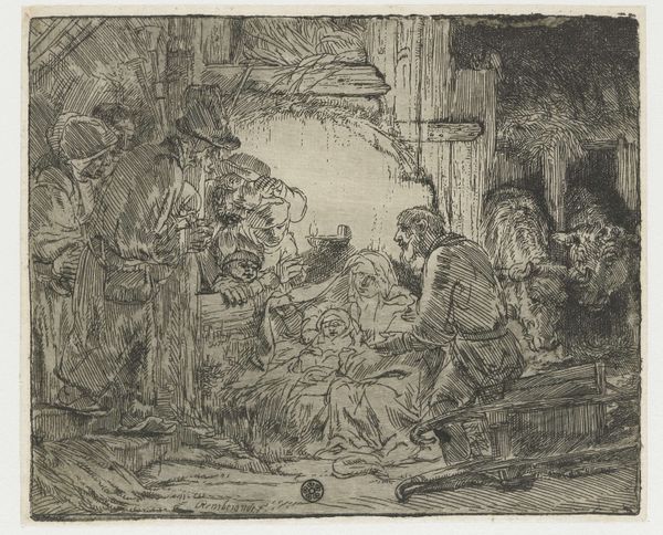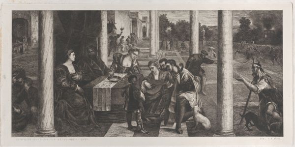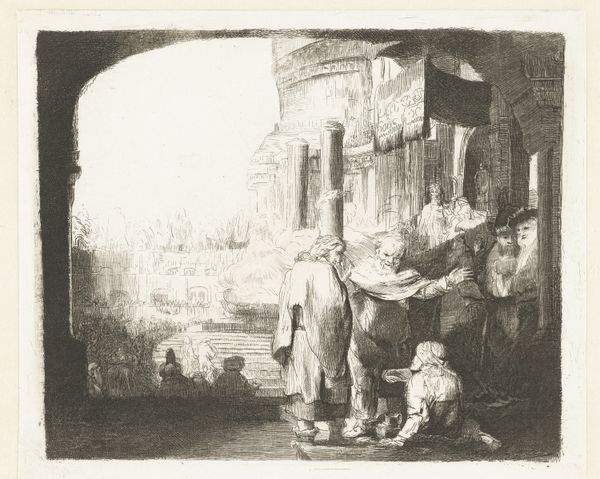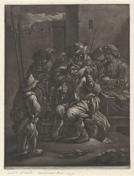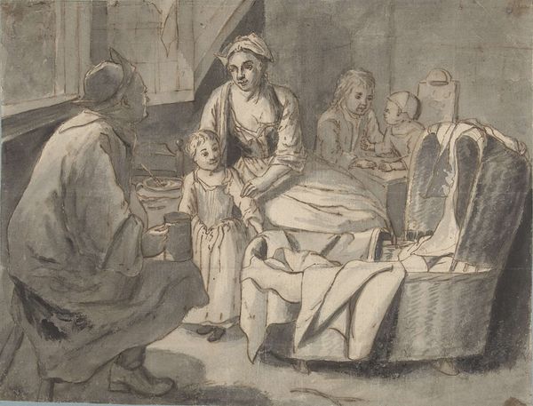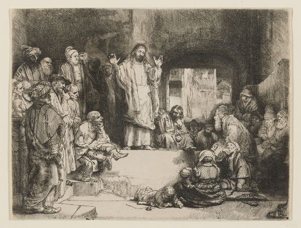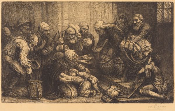 Editor: We're looking at "The Slave Market," a charcoal drawing by Alexandre-Gabriel Decamps. The composition feels really unsettling, with that central figure isolated on the platform. What do you see in the piece, from your perspective? Curator: Decamps’ drawing, with its manipulation of light and shadow, exemplifies a structured visual argument. Observe the stark contrast between the brightly lit figure on the platform and the murky background of potential buyers. The artist has deployed a formal visual strategy that directs our eye to the central subject. The arrangement emphasizes not simply what is happening, but how the viewer's eye moves around the image to process that information. The medium, charcoal, itself contributes; its inherent graininess reinforces the unsettling atmosphere. Editor: I notice how the lighter shades articulate a sense of drama. The crisp rendering of figures towards the right seem to establish a deliberate separation. Curator: Precisely. Decamps uses varying textures, and controlled tonal values, to further divide the scene—a separation mirroring social stratification? The foreground characters’ activities appear distinct and somewhat segmented from one another, which establishes compositional, and perhaps ideological, separation. Note the implied diagonal lines that lead from the lower left toward the elevated figure—visual vectors serving to direct our gaze. Editor: So it's less about what's depicted and more about how it’s depicted, revealing structure? Curator: Precisely. And it is from the formal arrangement of the figures that meaning emerges. Compositional choices create an expressive architecture of feeling. Editor: Fascinating. I never looked at it that way. The technical precision really elevates the emotional impact of this drawing. Curator: Indeed. It's through this formal analysis that we decode not just the representation, but also the artistic intent embedded within its visual language.