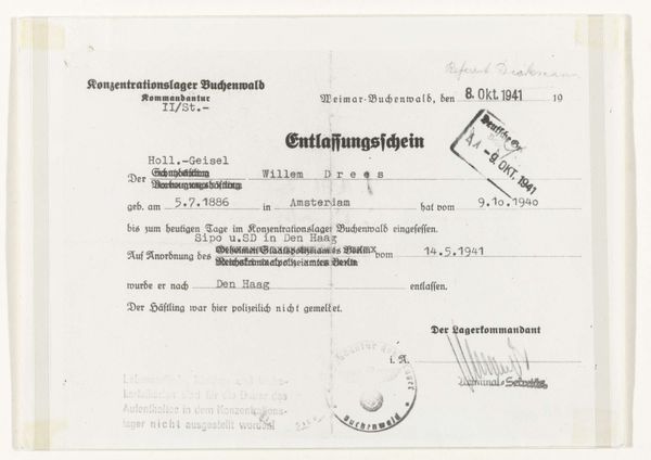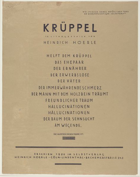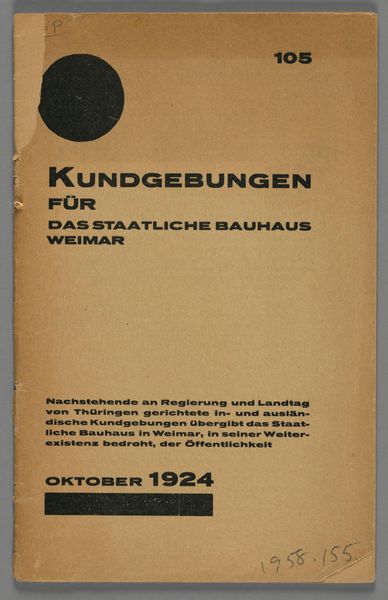 Curator: This is Oskar Schlemmer's announcement for the first Bauhaus exhibition in Weimar, dating to July-September 1923. Editor: It's striking how minimal it is, just blocks and lines. Almost feels like a blueprint. Curator: The Bauhaus was really trying to challenge traditional art academies. Schlemmer, deeply involved with the Bauhaus theatre, likely connected the figure to the school's ethos: rationality, abstraction, and the breakdown of artistic hierarchies. Editor: Right, and you see that in the printing itself. It’s a lithograph, a pretty accessible medium. The color blocking feels industrial, a conscious move away from the hand-painted. Curator: Absolutely. Consider the sociopolitical context of Weimar Germany, where art was seen as a tool for social change. Schlemmer and the Bauhaus were creating art for the masses. Editor: It makes you consider the role of labor in distributing knowledge, too. How many hands touched this poster? Curator: A good question. Schlemmer's poster invites us to consider not just the artistic vision but the material conditions that enabled its dissemination. Editor: Looking at it now, I appreciate how such basic materials carry such a big cultural weight.