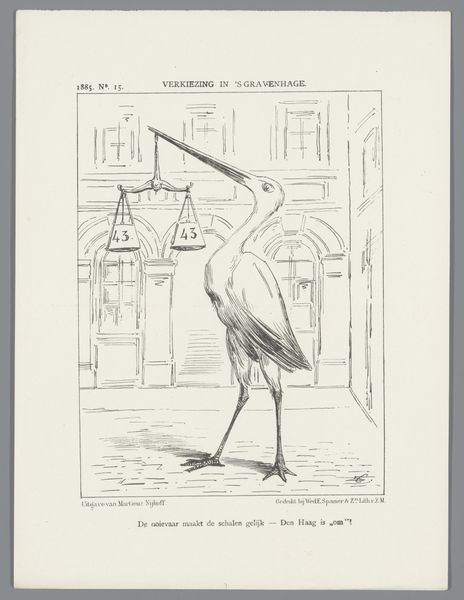 Curator: Here we have an interesting piece, a print called "Spotprent over Den Haag, 1887", a satirical print about The Hague, created by Johan Michaël Schmidt Crans. It uses engraving, pen, and drawing techniques. My first impression? It’s got this whimsical yet strangely critical air about it, like a fable waiting to unfold. Editor: Fable is right! The linework practically vibrates, but it’s so deliberately rendered—you can practically feel the layers of the printing process. It is literally on the surface: print. Curator: I agree. The sharpness really draws you in. And the central image—two storks conversing in front of what looks like a rather grand building in the cityscape of the Hague, one even carries a token with what I believe is the number 3. I immediately start asking myself about this particular token and what could have been the number three referencing to. It feels pregnant with symbolic weight, like the whole piece is gesturing at something beyond what’s depicted. What do you see, beyond the sheer craftsmanship? Editor: Well, storks, historically symbols of birth and good fortune, positioned in front of such imposing architecture... It strikes me as commentary on labor and status. This building and its production are a form of work, labor, a point further explored by the text below the artwork, but who are those "receiving" its benefits versus those who labor unseen? There is one stork carrying the token that you mentioned. Maybe pointing out something is paid by somebody, but enjoyed by others? This image teases out those hierarchies visually through size, positioning, and these intricate architectural details created laboriously by the artist. Curator: I love how you zeroed in on labor. It definitely gives a new dimension to my personal associations, which went right away for local legends or traditions. Now, the material constraints would inevitably play into the level of precision the artist can obtain, impacting both technical execution, as well as allegorical weight. It feels so open for interpretation. Editor: And those material choices make it so accessible, ironically. Printmaking allows for distribution, mass consumption even. Satire thrives on being seen, engaged with. It becomes a physical artifact of public discourse! So much for high art, the artwork almost begs us to interpret a narrative of how labor intersects with urban spaces and who the narrative leaves outside of the scene. Curator: Thinking of all of that labor creates in me a melancholic sense: we have the storks, maybe unaware of the political context that surrounds them. The viewer gets placed as someone outside of the image that has the knowledge and is prompted to analyze what happens inside the rectangle of the artwork. The symbolism suddenly turns much darker. It is interesting how materiality informs the piece's power of eliciting emotion and sparking analysis! Editor: Exactly. A reminder that even the most seemingly straightforward image is layered with meaning shaped by its means of production and what is trying to capture and show the audience!