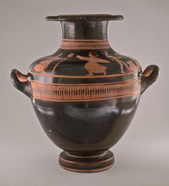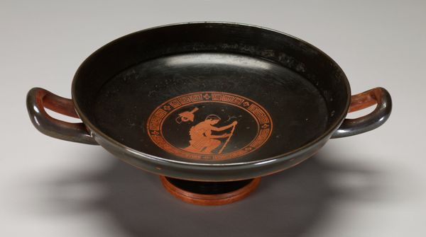 Editor: This is a Red-figure Kylix, showing a youth running, probably from the school of Euergides. It's small, just a few inches tall. What strikes me is how the image of the athlete is framed within the bowl. How would you interpret the piece's function within its cultural context? Curator: This kylix provides a window into ancient Greek society's values. Pottery like this wasn't just functional; it was a medium to showcase athletic ideals, central to their culture and social structure. How do you think the placement of the figure relates to its use? Editor: Maybe seeing the athlete at the bottom encouraged the drinker to feel like they were participating in the games themselves? Curator: Precisely. And consider how these images were disseminated and consumed. Pottery workshops, like the school of Euergides, became cultural producers, shaping and reinforcing societal norms around masculinity and competition. Editor: That's fascinating; it's not just a cup, it's a statement! Curator: Exactly! It shows us the public role that even everyday objects played in ancient Greece.
