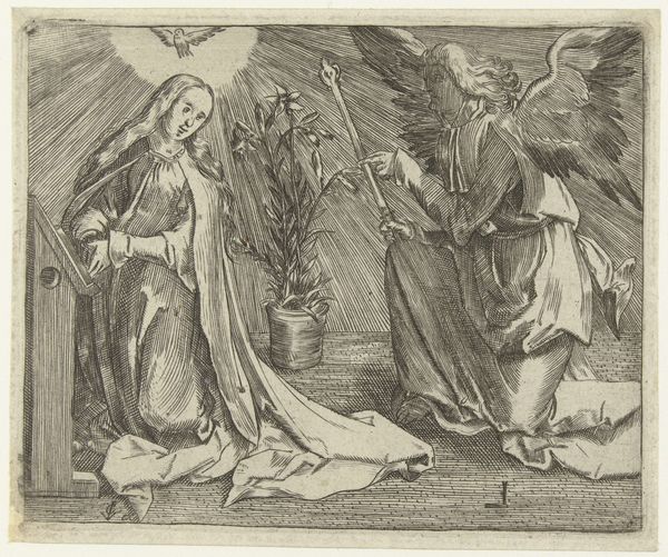 Curator: Welcome. Let’s discuss "Opdracht tot lofzang in een vreemd land," a 1640 print by Pieter Nolpe, now residing here at the Rijksmuseum. The style is Baroque, with sharp, intricate lines throughout. Editor: Immediately, the figures catch my attention—a winged angel addressing an older man with a staff and a woman holding a lute. It strikes me as a scene of divine instruction meets worldly acceptance, framed within an idyllic, yet somewhat austere landscape. Curator: That interplay is key. The print illustrates a scene from Psalm 137, confronting themes of cultural alienation and the imposed silence of the Jewish people during their exile in Babylon. Nolpe translates complex themes into this image, revealing nuanced sociopolitical implications. Editor: The lute, then, becomes more than just a musical instrument. It's a potent symbol of suppressed cultural expression. Its presence reminds me of Orpheus's lyre, suggesting an attempt to recover something beautiful from trauma. It makes one wonder if the Baroque lines themselves intend to trap that song from escaping this print. Curator: Exactly. Consider the angel’s directive hand and the reactions of the other figures. They represent different approaches to navigating cultural oppression and the forced surrender of symbolic expression. Nolpe challenges the assumed quietness with an active discourse, complicating ideas around power dynamics within art itself. Editor: There's an element of timelessness within its imagery. Although rooted in a specific historical context, it evokes themes of cultural subjugation and the power of creativity to find resistance—topics strikingly resonant today, despite the centuries that divide us from the artwork’s inception. It feels heavy with suppressed sound and a tense expectation. Curator: Yes, those very silences can speak volumes, resonating through our shared yet very different present and future. This piece serves as a point of meditation to question if we, in some small part, also witness angels sent to ignite expression amidst perceived constraints. Editor: Absolutely, and exploring these intersections makes encountering this historical piece such an engaging and continuously meaningful act.