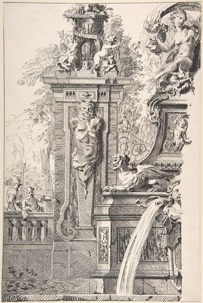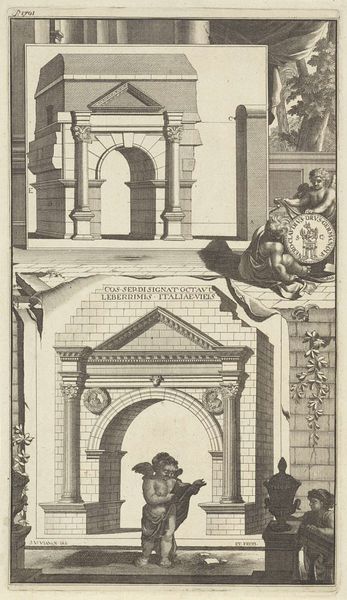 Editor: So, this is Jan Goeree's "A Reconstruction of the Castellum Aquiae Martiae (above) and a View of the Ruins (below)," made between 1690 and 1704, using ink. What really strikes me is the contrast between the idealized structure at the top and the ruins shown beneath. How do you interpret this work? Curator: It’s crucial to consider the *means* by which this image was created. Ink, as a readily available and relatively inexpensive material, democratized the dissemination of architectural knowledge. These prints allowed for a wider consumption of Roman ideals. Look at the layering—what does it suggest to you? Editor: It feels like Goeree is commenting on the passage of time, maybe? The upper image showcases how labor shaped nature, constructing something monumental, whereas the lower one demonstrates its ultimate decline. Is there an intended message here about labor or craftsmanship? Curator: Exactly! Think about the social context, here, too. The depiction isn't simply about ruins. It subtly acknowledges the human element and societal implications inherent to creating and then neglecting such constructions. Does the perspective the artist provides offer any insights? Editor: Possibly. The vantage point elevates the ruins. Instead of merely documenting, it lends a picturesque, almost romantic, quality. Were viewers supposed to contemplate not just the *what* but the *why* and *how* of Roman construction and subsequent disintegration? Curator: Precisely! It’s not simply admiring antiquity, but asking questions about material resources, about societal organization necessary to create such works, and ultimately, the socioeconomic reasons for the inevitable fall into decay and ruin. These prints prompted a material reflection. Editor: It really makes me think differently about these seemingly simple historical landscapes! Thanks, this was helpful! Curator: The intersection of materiality and historical context definitely enriches our understanding of this artwork.