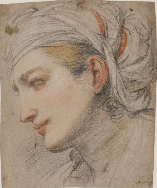 Editor: This drawing by Pier Francesco Mola, "Head of a young woman with a headcloth, in profile to the left", dating from around 1612 to 1666, is striking! It’s rendered in charcoal, which gives it such a soft, almost hazy quality. What stands out to you, as an art historian? Curator: I am intrigued by the use of line and form in Mola's work. Observe the delicate network of lines he employs to define the woman's profile and the draping of the headcloth. Note how the artist leverages the contrast between the hatched shading and the lighter areas to sculpt volume and generate a sense of depth. What does that evoke for you? Editor: It almost feels unfinished, but in a deliberate way. The haziness, like you said, it's almost like a memory, something ethereal and transient. But I'm wondering, why focus so much on form when the expression isn't as sharply defined? Curator: The power lies not in a realistic rendering of emotion, but in the interplay of the visual elements themselves. Notice how Mola masterfully uses charcoal to blend and blur the edges, softening the facial features and emphasizing the abstract qualities of the composition. It compels a deeper reading. Editor: I see what you mean. The absence of hard lines allows the eye to travel, exploring the tonal variations and appreciating the materiality of the charcoal itself. Is it possible he intended for this effect? Curator: Precisely. By drawing our attention to the medium and its application, Mola directs us away from pure representation and towards a heightened awareness of the formal elements that constitute the artwork. We can almost reconstruct his process just by carefully analyzing this. What does analyzing the materials contribute to our reading? Editor: I've certainly never thought about the use of charcoal so thoroughly, it's an eye opener. Curator: Agreed. Reflecting on how artists manipulate raw materials invites contemplation of their vision and technical skills.
