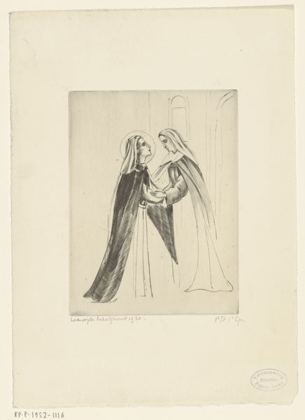 Editor: This is “Les Deux Mères” by Théophile Alexandre Steinlen, created in 1903. It's a drawing, it seems mostly pencil, maybe some etching as well? I find it very simple, almost unfinished, yet there’s a real tenderness in how the mothers are holding their children. What catches your eye? Curator: What immediately strikes me is the medium itself: pencil. Steinlen's choice of such an accessible and readily available material is significant. Consider the socio-economic context of 1903 Paris; cheap materials like this connect directly to a world of accessible art-making and broader consumer habits. How does the seeming sketch-like quality speak to the social realities he was portraying? Editor: I hadn’t thought about the *pencil* itself being important, just what it depicted. So, the everydayness of the pencil connects to the everyday lives of these mothers? Curator: Precisely. And observe the deliberate looseness of the line work. Is it simply unfinished, or is Steinlen actively rejecting academic polish in favor of capturing something raw, immediate? Something of working-class life and labor perhaps? Think about the cost of oil paints versus pencils at the time, how does access to art making shape not only who can produce it, but how it represents reality? Editor: So, he’s making a conscious decision to use less precious materials to depict a subject – motherhood – that’s often romanticized? The roughness of the pencil counters that? Curator: Absolutely. It brings the realities of labour into focus – the material process of art mirrors the labour of motherhood itself. How does thinking about it that way change your understanding of the image? Editor: It makes me think about how even the materials artists choose have a voice, can tell a story about their world. I'll never look at a pencil drawing the same way again! Curator: Exactly, seeing the artist's hand through the materials they use, it connects us more deeply to not just their image but their lived reality.