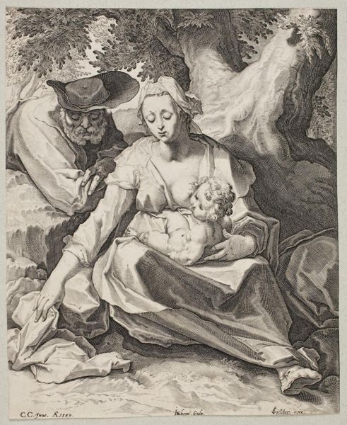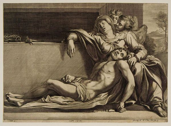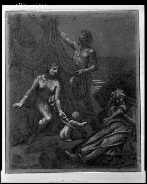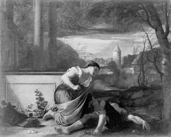 Editor: We're looking at Philip van Dijk's oil painting, "Susanna and the Elders," created sometime between 1695 and 1753. The monochrome palette gives it an almost haunting quality. What cultural or psychological narratives do you see embedded in this scene? Curator: Indeed. The scene depicts Susanna, surprised while bathing, confronted by the gaze of the elders. It is crucial to understand that it is not simply a genre scene, but is loaded with iconographic significance, harkening back to much earlier Christian, Roman, and even Greek precedents, concerning themes of voyeurism and unjust accusation. Editor: So, you’re saying it’s more than just a snapshot; there’s a weight of history behind it? Curator: Absolutely. The monochrome adds another layer, reducing the sensory and focusing our attention on the psychological dimensions, forcing us to grapple with Susanna’s vulnerability. Ask yourself, what does the elder's proximity mean? How are our present-day ethics regarding private vs public action being represented through art? What elements within this work stand as a testament to enduring concepts? Editor: It’s fascinating how a single image can contain so many interwoven layers of meaning and lasting representations. Thanks for helping me look beyond the surface. Curator: My pleasure! By understanding the deeper symbols, we connect with centuries of shared human experience through these artistic interpretations.