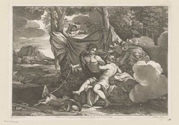 Curator: This intriguing engraving, dating from around 1640, is entitled "Nox (Night)" and it’s by Charles Le Brun. The artwork presents a nocturne with figures set against a dramatic backdrop. What is your initial reaction to this composition? Editor: There's a palpable tension created by the dramatic chiaroscuro. The heavy, dark lines against the stark white of the paper amplify the drama, making it feel quite theatrical. The figures are strikingly rendered. Curator: The composition draws heavily from the prevailing classical-realism style and the subject positions itself within traditional historical painting. The allegory of Night, however, opens avenues for feminist readings: her traditionally masculine posture contrasts with her vulnerability shown here, supine on the earth and dependent on male figures around her for support or security. Editor: You know, my first thought was not about the social and political contexts. Rather, how the distribution of light affects the organization of forms: The almost theatrical lighting accentuates the musculature and dramatic pose of the foreground figure and contrasts the figures lurking in darkness. This builds a visual rhythm that draws you across the scene. I suppose what really stands out to me is how the artist plays with form and the balance across the image. Curator: I think Le Brun is making a conscious comment about the patriarchal dynamics of his time by presenting Night in a moment of human vulnerability, stripping her of any inherent power or authority. Is the use of line creating patterns of repression and control? What about the very absence of pigment that speaks to lack, darkness and erasure? Editor: That’s an interesting point. And maybe a bit overstated. Perhaps it's also simply a study in contrasts—light and shadow, strength and vulnerability—that Le Brun uses to construct a dynamic visual field, which has an emotional rather than an explicit sociopolitical core. Curator: Perhaps both? We often limit our reading of early art by confining interpretation to binaries when art and the culture that generates it operates along so many more spectrums. Thanks to this image, we’ve now modeled intersectional dynamics, too! Editor: Yes, precisely. Perhaps through these visual conversations with Le Brun, we gain a more multifaceted comprehension.