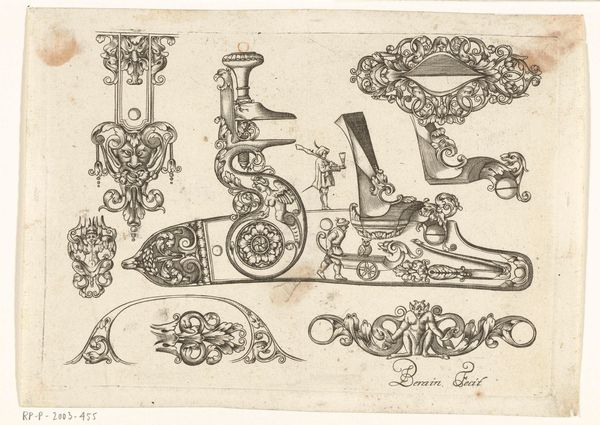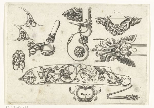 Curator: This exquisite pen drawing, "Ontwerpen voor onderdelen van musket of haakbus," created around 1659 by Jean Berain, is part of the Rijksmuseum's collection. It details designs for elements of a musket. What are your immediate impressions? Editor: My eye is immediately drawn to the incredible ornamentation—the flowing lines and baroque details create a peculiar tension between beauty and destruction. It is fascinating. Curator: The semiotic density is striking. Note how Berain combines floral motifs with human figures within these designs. He transforms lethal objects into miniature stages for classical dramas, as it were. Editor: Indeed, observe how the cherubs and foliage interweave with the cold, hard steel. One almost forgets that these are weapon components, their violent function hidden behind layers of culturally-laden imagery of peace and beauty. Curator: Berain's structural use of symmetry is also worth mentioning. Each element mirrors itself, amplifying the visual impact while subtly drawing attention to the mechanical exactitude necessary for firearms. Editor: Beyond the form, I find myself contemplating the weapon itself as a cultural symbol. The musket in 1659 represented both power and societal order. To embellish it thus... it speaks of an elite class eager to project its authority through artistic mediums. Curator: Quite right. Berain seems conscious of this duality, masterfully melding technical design with ornate embellishments in the hopes of evoking a feeling of imposing elegance. Editor: Thinking about the broader legacy of firearms in our history, the drawings feel especially poignant. It’s strange to think such refined drawings paved the way for so much destruction. Curator: Perhaps there's a certain inevitability in it—form following function in a morbidly beautiful sense. Thank you for your time. Editor: Thank you; those structural elements revealed deeper layers than I expected!