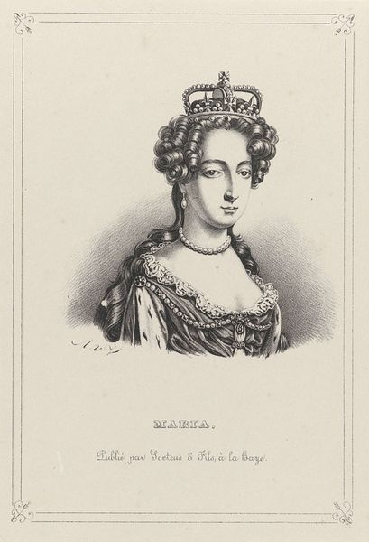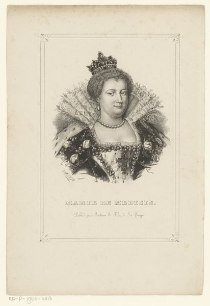 Editor: So, this is "Portret van Catharina I van Rusland," or Portrait of Catherine I of Russia, a print from around 1842. Looking at it, I’m immediately struck by the formality, the almost clinical precision of the lines. It feels very…composed. What do you see in this piece, beyond just the regal appearance? Curator: Clinical precision… hmm. I see what you mean! But, you know, when I gaze at this, I imagine candlelight flickering across the original, lending warmth, maybe a hint of softness where now there is line. Think about the printmaker, Augustine Fauchery. He probably wasn't aiming for cold accuracy but for evocative grandeur. It's interesting how we now interpret historical images through a modern lens, isn't it? We look for realism, while he might have been aiming for a carefully constructed *impression* of power. Does that shift your perspective at all? Editor: It does, actually. The word "impression" really unlocks it. So, it's not really trying to be photographic, more...iconic? Curator: Exactly! It's less about "this is *exactly* what she looked like," and more about "this is the *idea* of Catherine." Power, regality, perhaps even a touch of serene authority. We, in the future, tend to view historical imagery in relation to truth, and this affects how we process its qualities. Editor: I get it! Like a highlight reel of Catherine's brand. Looking at her gaze in that light, it gives a subtle look of confidence to Catherine's bearing. Thanks, I’ve never thought of portraits as highlighting something like this before.