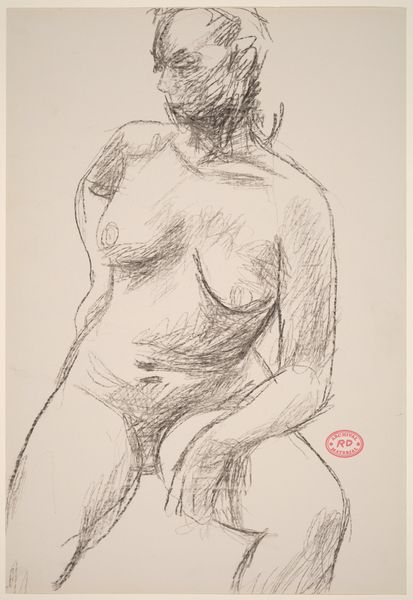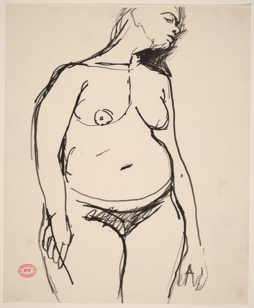 Curator: Before us we have Richard Diebenkorn's "Untitled [seated female nude with right hand to forehead]," an ink drawing that dates between 1955 and 1967. Editor: It feels so immediate, almost frantic. The rapid, scratchy lines of ink give the figure a real sense of unease and introspection, as if capturing a fleeting moment of vulnerability. Curator: The pose certainly evokes contemplation, doesn’t it? Her hand obscuring her face could symbolize hidden thoughts, or perhaps the weight of societal expectations. Nudes have carried layers of symbolic meaning for centuries, from idealized beauty to representations of mortality. Editor: Agreed, but there’s also a powerful use of positive and negative space here. See how the blank paper acts as a stark contrast to the density of lines forming the figure? The strategic void actually enhances the feeling of isolation, forcing our eye to engage with the raw simplicity of the composition. Curator: That contrast directs focus to the gestural qualities as well; the ink rendering possesses a graphic immediacy that evokes 20th century existential anxieties so common at the time this was executed. Note how Diebenkorn uses the ink almost to sculpt her posture in emotional distress. Editor: Absolutely. Look at how certain lines are weighted, dark and confident, then abruptly become tentative, fragile. These abrupt changes reflect this very visible push and pull on the picture plane. The texture itself provides clues for its historical reading. Curator: We’re left wondering about her internal state; it's a timeless representation of private reflection that persists, transcending decades after its creation. Editor: Yes. In the end it is less about the 'what' and more about the 'how.' The sum is, remarkably, greater than its swiftly rendered parts.