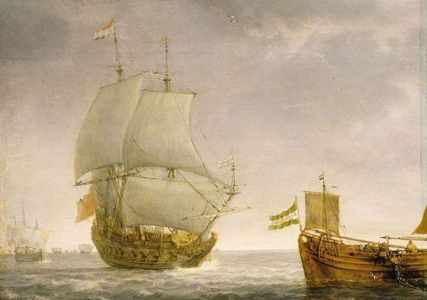 Editor: This painting, "Shipping on the Maas, Dordrecht" by Aelbert Cuyp from the early 1650s, is incredibly striking. The light on the water is gorgeous, but I'm also aware of all those Dutch flags waving – they're everywhere! How do you interpret the presence and scale of these ships within the cityscape, from a historical context? Curator: That's a keen observation. The flags immediately signal this painting's participation in a particular visual and political vocabulary. The prominence of ships wasn't merely aesthetic. In the Dutch Golden Age, the period following their independence, maritime power equalled economic and political clout. Cities like Dordrecht thrived as trade hubs. Do you think the artist included a generic cityscape, or are they capturing more about Dordrecht and its function? Editor: I think it has to be more intentional. Genre paintings don’t usually carry overt political messaging, but including the Dutch flag everywhere certainly makes you consider the might of their trading power. It’s both a cityscape and a statement of national identity, then? Curator: Precisely. Cuyp is documenting a bustling port city, but also subtly reinforcing a narrative of Dutch dominance and civic pride. Consider how the church steeple serves as an enduring symbol juxtaposed with the dynamic, mobile vessels – both vital elements of Dordrecht's identity. It also reminds viewers of their hard-fought battle for liberation and economic prosperity. Would you agree the ships evoke the feeling of freedom? Editor: I definitely agree that the painting exudes a confident and energetic atmosphere. It also showcases the country’s powerful influence in trade and global affairs. I didn't realize how much political history could be encoded in a seemingly simple genre scene. Thanks! Curator: My pleasure. By acknowledging art as socially situated, we learn about historical, political, and economic events through art. It becomes easier to read their embedded, though perhaps veiled, viewpoints and values.