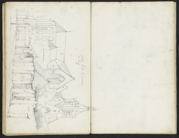 Editor: So, this drawing, "Groenteverkoopster op de Achterstraat te Culemborg" by Willem Koekkoek, was done sometime between 1849 and 1895, using pen, ink and pencil on paper. It's really just a quick sketch, but the architecture seems very precisely drawn. What stands out to you? Curator: It's interesting to consider the materials Koekkoek employed and what they tell us about the image's purpose. The use of pencil and ink suggests this wasn’t intended as a finished, marketable artwork, but more of a study, a way of documenting and understanding the urban environment. It’s about the process of seeing and recording. Editor: Right. It feels very immediate and utilitarian, like the artist just wanted to capture the scene. Curator: Exactly. Look at the details he chose to emphasize – the lines of the buildings, the structure of the market stall. He's examining the infrastructure that facilitates daily commerce and community life. Think about the social context: Culemborg was a small city. Editor: So, you're saying it is less about aesthetics and more about documentation of everyday labor? Curator: Precisely. And we should consider the value of the sketchbook itself. The physical act of sketching makes the artist more attuned to the scene. Was Koekkoek trying to point out social strata? Was he challenging, supporting, or ignoring the economic context? These are key points in this study. Editor: That's really interesting. I hadn't thought about it in terms of the labor that went into even the making of the sketch, let alone what the sketch depicts. Curator: Yes, it reminds us that art is never separate from the means and conditions of its production and its context within the economic landscape. Editor: Well, I’ve certainly got a new appreciation for sketchbook art! Curator: Me too. Examining art through a materialist lens reveals these hidden narratives.