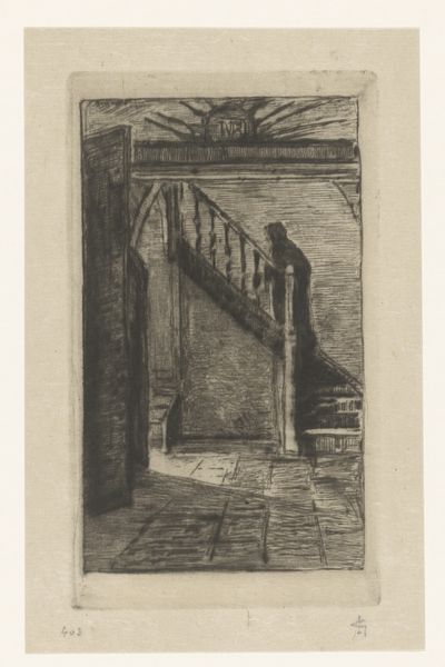 Editor: This etching by Arend Hendriks, called "Trap," made sometime between 1911 and 1943, depicts a dark staircase with, what I think are, glowing eyes at the top of the stairs. The deep shadows definitely create a sense of unease. What do you see in this piece? Curator: I see a potent commentary on spatial confinement and psychological unease, which, considering the era, could speak volumes about the interwar period and the rise of totalitarian regimes. Look at how the geometric rigidity of the stairs contrasts with the organic curve of the railing, creating a visual dissonance, and how that tension creates meaning. Who is being trapped, and by what? Is it physical, or societal expectations and constraints? Editor: That's interesting, I was just thinking it was kind of creepy! Are you saying it might be a metaphor? Curator: Art often operates on multiple levels, inviting viewers to consider both the immediate sensory experience and its underlying sociopolitical contexts. Hendriks might be using this claustrophobic space to mirror the oppressive atmosphere that many Europeans experienced. Does that reading shift how you understand the work? Editor: It does. I was stuck on the literal image, but considering the historical context adds a whole new layer. It's like the "trap" is society itself. Curator: Exactly. The stark contrast of light and shadow, almost a stage lighting effect, can represent the stark choices individuals faced during that time—conformity or resistance, visibility or obscurity. Think about who might be lurking in the shadows, watching. Does it feel predatory? Editor: Definitely predatory. Seeing those eyes now, it feels like being watched, scrutinized, like there's no escape. I appreciate you making me see it differently. Curator: And I appreciate your openness. It's through this kind of engaged dialogue that we can excavate the hidden depths within these seemingly simple images and understand them in all of their cultural nuance.