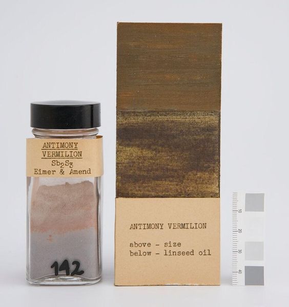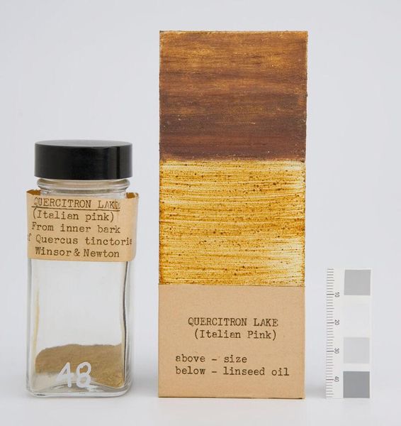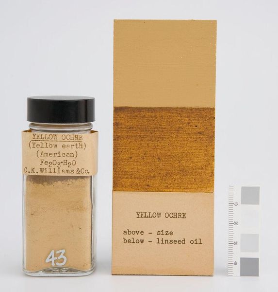 Curator: This is a pigment sample, “Orpiment (King’s Yellow),” manufactured by Charles Roberson & Co. Editor: There's a quiet allure in its subdued presentation, the granular pigment contained within glass, juxtaposed against a simple card. Curator: Orpiment, chemically arsenic sulfide, enjoyed a rich history. Its brilliance made it highly sought after, though the toxicity posed risks. Editor: The card showing the pigment with linseed oil makes me think of a pre-industrial color chart, a relic documenting artistic practice. Curator: Indeed. Artists relied on pigments like Orpiment, and these materials deeply influenced the chromatic range of paintings. Editor: It prompts consideration of the artist’s agency, balanced with the material constraints inherent in each historical moment. Curator: Yes, how materials shape the arc of art history. Editor: Precisely; a fascinating insight into how substances impact our visual world.