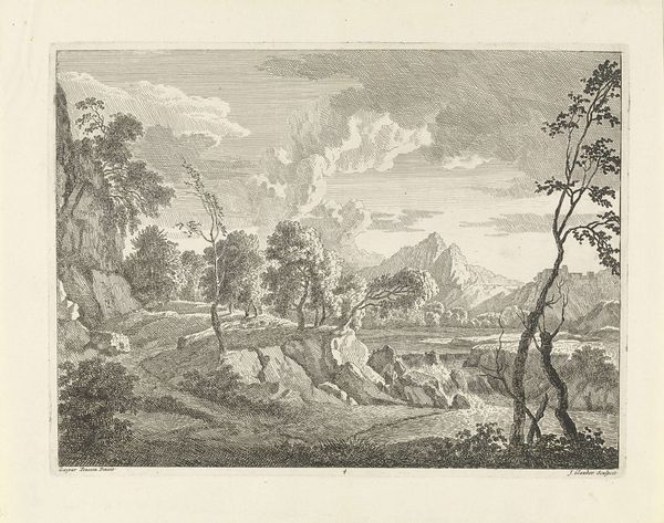 Editor: This engraving, "Ruiter te paard van een brug vallend" – "Horseman Falling from a Bridge" – by Christophe Guérin, dates from between 1768 and 1831. It's currently housed at the Rijksmuseum. It has such a chaotic energy! There’s a sense of unexpected drama within a landscape scene. What cultural context informed a piece like this? Curator: That's a keen observation! This piece reflects the rising popularity of genre painting and Romanticism. Consider the institutional framework that supported Guérin: printmaking academies, royal commissions, and the burgeoning art market. It demonstrates a narrative. It isn't just a simple landscape; it depicts an accident, which hints at a larger story. What do you think this says about the values or anxieties of the time? Editor: Perhaps a fascination with the unpredictable nature of life, the dangers lurking even in pastoral settings? Or a commentary on the class differences where commoners risk mishaps, but horsemen still dominate the landscape? Curator: Precisely! Consider also how prints like these functioned within society. They democratized art, bringing images – and the ideas they conveyed – to a wider audience. These prints would circulate, shaping public opinion and reflecting certain cultural narratives. Are there any elements that give you pause or provoke further thought? Editor: I'm struck by how the human figure, vulnerable and fallen, is juxtaposed with the horses which still represent power and control, almost indifferent to the fallen rider. This is not the grand history painting that used to be important. Curator: It's an interesting lens through which to observe changing societal values and artistic tastes. Understanding how institutions and the art market facilitated Guérin's career can unlock layers of meaning within this seemingly simple scene. Editor: It really shows how social conditions can shape what an artist chooses to represent. It gives the landscape more importance and depth. Thanks for this richer context!