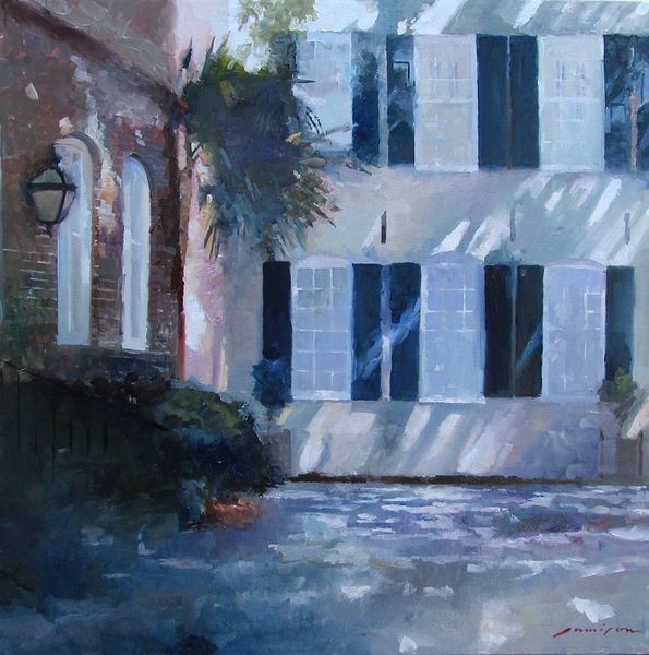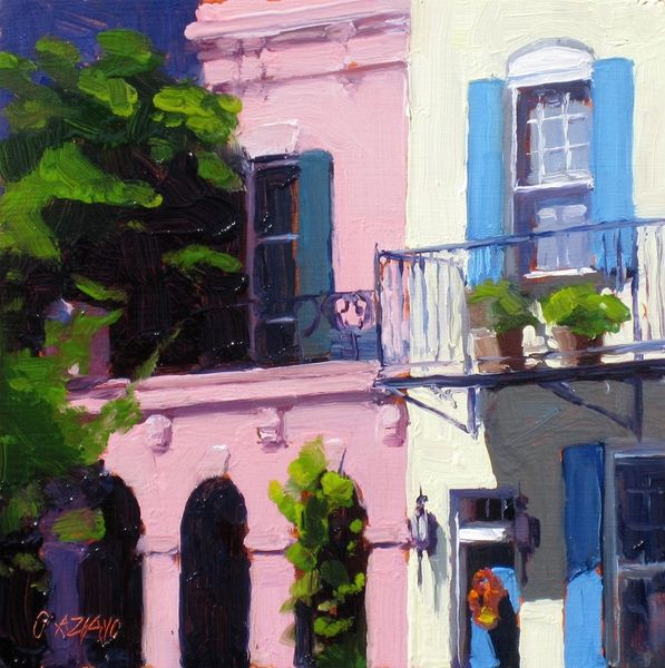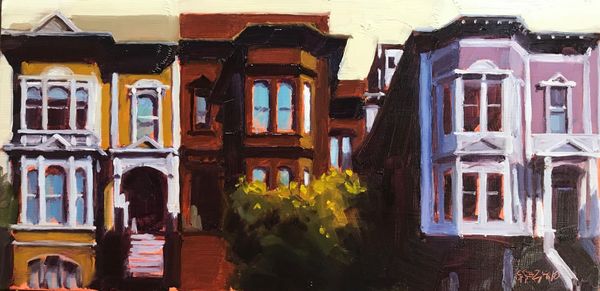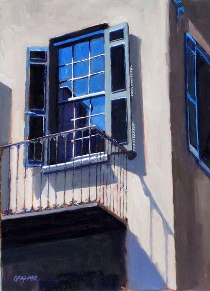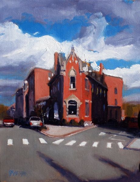 Curator: Dan Graziano’s “Six Windows” offers a striking view of urban architecture. What’s your immediate take? Editor: Stark. The severe angle, the unrelenting geometry—it almost feels…oppressive? The color palette seems deliberately muted, focusing the viewer’s attention on the rigid lines of the building itself. Curator: I see a focus on materials and the act of production. The plein-air technique and medium speak to Graziano's attempt to directly represent an existing environment. Look at the textures and tones chosen here: They emphasize the building’s worn facade—a portrait of urban labor and living through surface and visible wear. Editor: I’m more interested in the structural relationship. Notice the way the composition directs the eye upward along the building's edge. The interplay between the solid brick and the glassy openings. Each window is distinct. Are these not representative of how an artist plays with depth and surface within a contained pictorial space? Curator: Each one’s distinct, perhaps, because Graziano isn't trying to manufacture some grand illusion. It reads like visual reportage to me. The materials, chosen specifically to reflect urban realities. The lack of grandeur feels deliberate; he wants us to acknowledge the buildings and blocks we too often overlook. Editor: That sky though… that unyielding cerulean pressed against aged brick. It serves a deliberate contrasting purpose—heightening the sense of depth. It gives the work that touch of class which allows it to work aesthetically beyond social context. Curator: I read more social commentary into it, honestly. These are homes, workspaces… boxes. "Six Windows" made me think of how architectural elements become both structures of confinement and, ironically, access to expansive views. This act of documenting transforms an otherwise banal setting into something…reflective. Editor: Still, despite that possible contextual narrative, it's hard to deny the power of composition at play here—creating formal interest even before narrative considerations. Curator: Yes, but acknowledging Graziano’s broader awareness enriches how we relate to, or perhaps, react against the painting. Editor: Point taken. It makes you re-examine your initial perspective. Curator: Exactly, it encourages viewers to reconsider our own place. Editor: A building becomes a silent witness to urban living…fascinating.