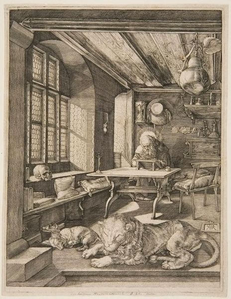 Curator: Looking at this reproduction of "Saint Jerome in His Study," I’m immediately drawn to the pervasive sense of quietude. Editor: It feels very staged, doesn't it? Consider the materials used in his study: the craftsmanship of the desk, the precise rendering of the lion's fur. What does all this meticulous detail say about labor and class? Curator: It certainly reflects a particular kind of privilege, but consider also the historical context. Jerome’s translation of the Bible into Latin was a monumental act of cultural production that shaped Western thought for centuries, and we must view it through that intersectional lens. Editor: Yes, but the tools of that production—the ink, the paper, the very room itself—speak to the material conditions that made such a translation possible. Curator: And let’s not forget how depictions of Jerome have served as tools of power, reinforcing certain patriarchal structures throughout art history. Editor: Indeed, and this work reveals how those structures were built, quite literally, with earthly materials. Curator: Understanding these debates, both material and ideological, helps us unpack its historical and cultural significance. Editor: Absolutely, by questioning the tools of production, we expose the foundations of such interpretations.