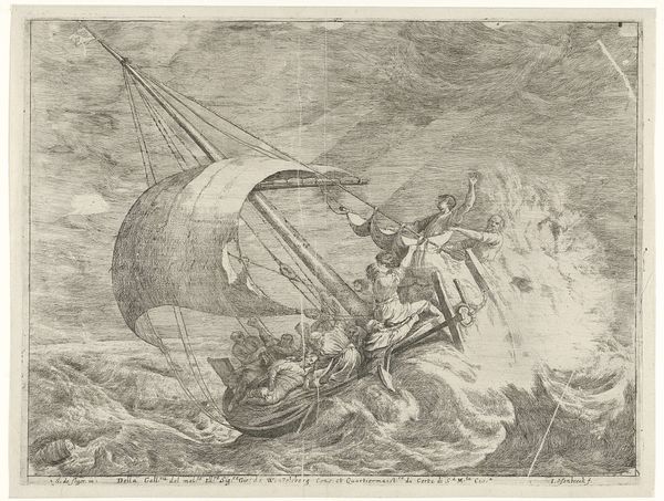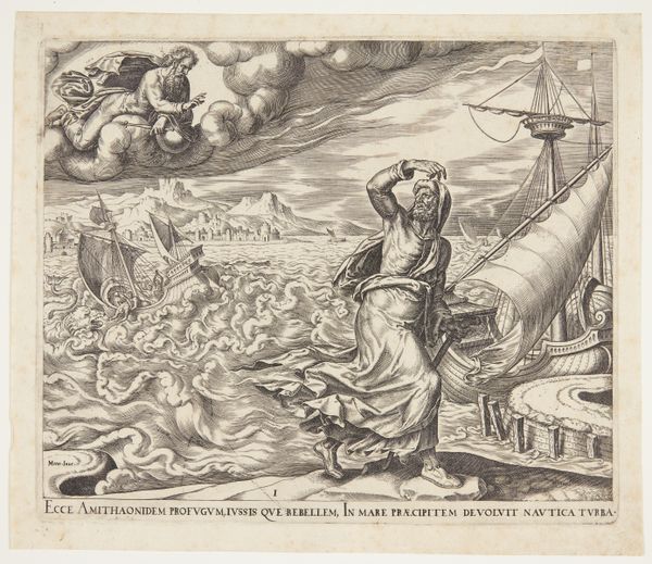 Cornelis Cort created this print, "Two Galleys behind a Three-Master, with the Fall of Phaeton in the Air," sometime between 1533 and 1578. The work presents a dramatic interplay of marine and celestial elements, rendered in meticulous detail. The composition is split between the earthly realm of ships at sea and the mythical scene unfolding in the sky above. Cort's strategic use of line and contrast guides our eyes, creating a dialogue between the classical narrative and the maritime scene. The fall of Phaeton, drawn from Ovid’s Metamorphoses, serves as a dramatic counterpoint to the earthly pragmatism of seafaring vessels. It’s a juxtaposition that might encourage us to reflect on themes of ambition, fate, and the delicate balance between human endeavor and divine will. Notice how the artist uses texture to distinguish between the turbulent waves and the ethereal clouds. Cort’s emphasis on detailed rendering and thematic contrast invites viewers to consider the complex relationship between classical mythology and the cultural context of maritime exploration. The print invites ongoing interpretation, acknowledging the fluidity of meaning that is inherent to visual art.