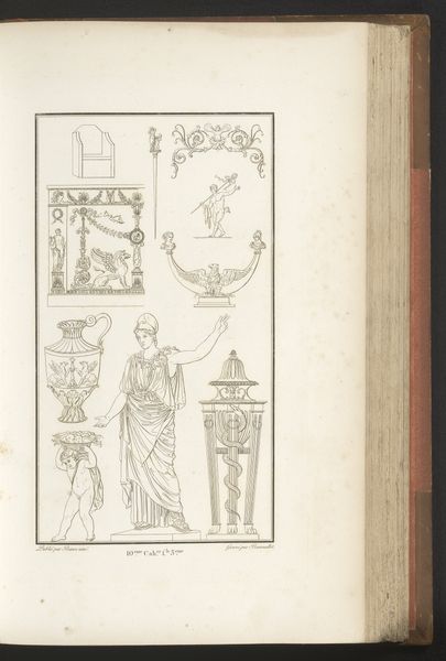 This page of ornament studies was designed by Pierre-Nicolas Beauvallet, a French sculptor, sometime in the late eighteenth or early nineteenth century. It is made using pen and ink on paper. Beauvallet's drawing reflects a renewed interest in classical motifs, neoclassical style, and design. While Beauvallet was known for his skills in carving stone, here, he demonstrates fluency in ink drawing, using it to create diverse ornamental designs. The drawings focus on symbolic objects and human forms reminiscent of ancient Greece and Rome. Note the labor evident in the meticulous details, from the muscles of the figures to the feathers of the eagle. The medium of pen and ink lends itself to the creation of precise lines and intricate patterns. The designs are studies, which would have been reproduced as prints, for use by other artisans. This underscores the division of labor inherent in the production of ornamental sculpture.