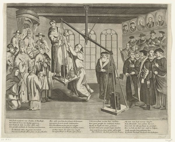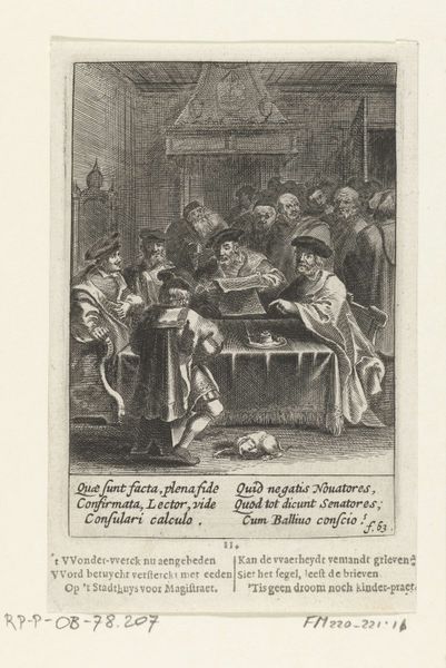 Carel Allard created this print, "Quakers Meeting," sometime between 1648 and 1709, likely in the Netherlands, using etching. This image purports to show a gathering of Quakers, a religious group that emerged in England in the mid-17th century and spread to the European continent. The artist creates meaning by presenting the figures in plain dress with sombre expressions, gathered in a sparse room, elements that aligned with the Quaker values of simplicity and humility. Allard seems to emphasize the Quaker practice of allowing women to preach, which was very progressive for the time. Historical sources indicate that in the 17th century, the Dutch Republic was known for its relative religious tolerance, which allowed groups like the Quakers to practice more freely than in other parts of Europe. Prints like this one are valuable historical documents, offering insights into the social and religious dynamics of the time. Further research into Dutch social history and the history of Quakerism would reveal even more about the context and meaning of this image.