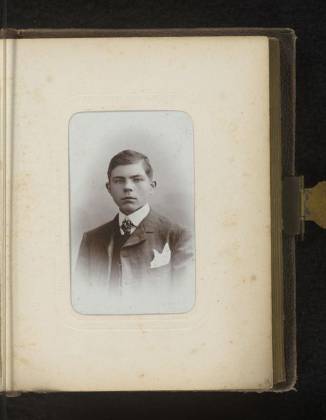 Editor: This is a gelatin-silver print photograph titled "Portret van een man" or "Portrait of a Man" by Christiaan Martinus Jan Hermelink, created sometime between 1866 and 1900. It's small and intimate; it gives me the feeling that it's almost hidden in its mount. What do you see in this piece? Curator: I see a powerful commentary on the rise of the bourgeoisie and its relationship with representation. The formal attire, the meticulous presentation in the album, this isn’t just about commemorating an individual, it's about signaling social status. Photography, particularly portraiture, was becoming increasingly accessible at this time. Editor: So, it’s not just a portrait of a man, but a signifier of something larger? Curator: Precisely! This portrait, likely commissioned, participated in the construction of identity and respectability. It speaks volumes about how individuals wanted to be perceived within their specific social context. Notice also how it's presented as part of a collection; likely a family archive of some kind. These images were performative in that the person memorialized hoped it would convey who they were to generations hence. How would *you* display a portrait today? Editor: Probably on social media for everyone to see instantly. Interesting to think how different that is. Curator: Indeed! The transition from a private, familial display to a public, globally accessible image speaks volumes about the changing role of the photograph in constructing identity. The meaning isn't intrinsic but contextual. Editor: It changes completely based on how and where it's shown. I hadn't really considered that before. Curator: And that shift affects our interaction and the power this art has in today's age. Thank you!