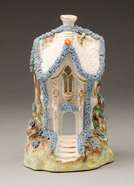 Editor: This is an earthenware still bank, in the shape of a house. It’s titled '-Savings Bank (house)- still bank' and dates to the 19th century. I find the colours quite charming and playful. What symbols stand out to you, and what could they mean to people from the time? Curator: The house form itself is very telling. The home is often a primary symbol of security and stability, especially during periods of economic uncertainty. What kind of stories do you think this miniature architecture tells about aspirations for financial stability? Editor: That's an interesting idea – like domestic security being equated with economic security? What about the figure carrying the sack of money? Curator: Precisely! And note the figure – ostensibly a prosperous gentleman – bringing bags of money to deposit. Is he a responsible member of society, or is there perhaps an element of satire or social commentary in this portrayal? What if the individual savers weren't always successful and faced economic hardship? Editor: Hmm, satire. It makes me think about how saving was encouraged – even propagandized – back then, and how different that is now. Almost like it's feeding on a kind of insecurity about finances? Curator: Well, does this 'piggy bank' then encourage hope for a comfortable life, or subtly reflect a system where such comfort is elusive for many? Does it normalize personal anxieties regarding personal finance? Editor: That's given me a whole new perspective on what a simple object like this bank can represent. I guess there's a lot more to it than just somewhere to save your pennies! Curator: Exactly. Visual symbols and the stories they convey reflect deep cultural anxieties and longings that resonate across time. I hadn't thought about the contrast to contemporary attitudes towards finance, thanks for pointing that out!