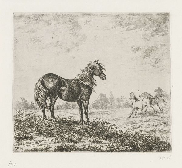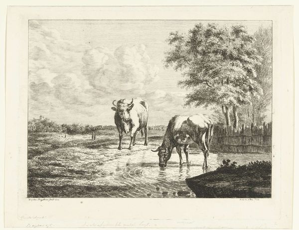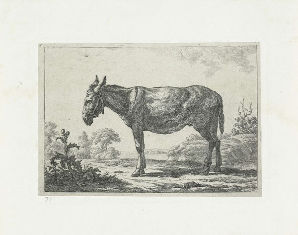 Editor: We're looking at Karel du Jardin’s “Mule with bell on halter and two reclining donkeys,” an etching from 1653 currently residing in the Rijksmuseum. The donkeys seem pretty unbothered by anything going on; they're just chilling in this Dutch Golden Age landscape. What can you tell me about the way that viewers might have thought about this piece back when it was made? Curator: That's a perceptive initial reading. This etching taps into a growing interest in genre painting and realistic depictions of everyday life in the Dutch Golden Age. However, it’s essential to recognize the social hierarchy implied here. Who, do you think, were the viewers who might have acquired this kind of image? Editor: Likely upper-middle-class citizens with enough money to purchase art prints? Curator: Exactly! And what does the choice of subject matter – these working animals, depicted in a relatively humble landscape – signify in that context? Could it reflect an idealized vision of rural life held by urban elites? Consider how artists like du Jardin were often patronized by those seeking a connection, however romanticized, with the land. Editor: So, this etching isn't just a simple snapshot; it's playing into a broader cultural narrative. It reminds me a bit of history painting, as though the common person had some moral gravitas to offer society. Curator: Precisely. It invites us to examine the power dynamics at play and to question how art functions to both represent and construct social identities. How the emerging art market and museum culture gave form to how this society viewed its reflection in art. Editor: I hadn't thought of it in terms of social identity before, more just appreciating an idyllic landscape. Thank you for providing this different framing! Curator: Of course! Considering these pieces within a broader societal context really does enrich our understanding.