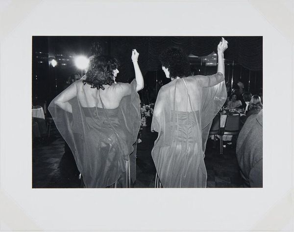 Curator: Elaine Mayes's black and white photograph, "Disco Dancing", captures a moment of social liberation. Editor: It's an intriguing blur! The motion suggests a space throbbing with collective energy, a frenzy of bodies and light. Curator: Yes, Mayes's work reflects the transformative power of disco culture in the late 70s, where marginalized communities found expression. The image can be viewed through the lens of identity and the politics of dance. Editor: The long exposure allows us to see the flow of movement through the physical space. I wonder how the photographer navigated the technical challenges of capturing this scene. Curator: It's a powerful representation of a cultural phenomenon, reminding us of the significance of music and movement as forms of resistance and self-discovery. Editor: Definitely, and it makes me consider the labor involved in creating such a dynamic visual record of a specific moment in time.