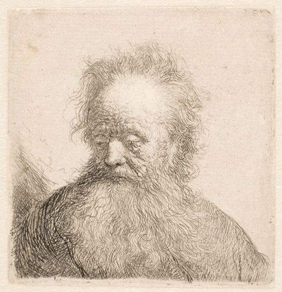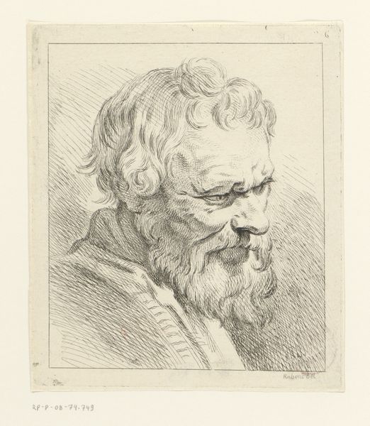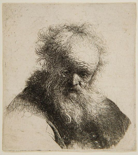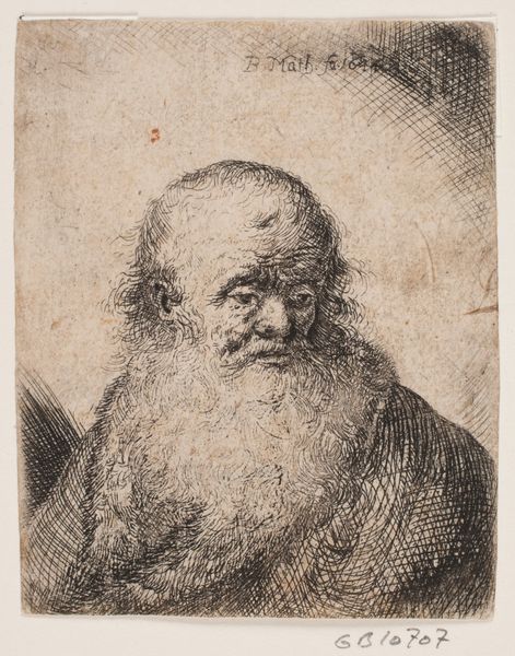 Editor: So this is "Skægget Olding, Brystbillede," created sometime between 1733 and 1816 by W.A. Müller. It’s a small print, an engraving actually, depicting the bust of an old, bearded man. It’s quite somber and intimate. What strikes you about this image? Curator: The immediate draw for me lies in the rich tapestry of lines. Notice how they aren't merely descriptive; they are evocative, almost breathing life into the aged face. It's less about simple representation and more about distilling a feeling, an essence of age and perhaps even wisdom. Does the subject remind you of any familiar archetypes? Editor: He reminds me a bit of depictions of hermits or maybe even a prophet, someone connected to the earth and possessing great insight. It could be because of the beard! Curator: Precisely. Beards have carried symbolic weight across cultures for millennia, representing virility, wisdom, and status. The downturned gaze reinforces this impression of introspection, inviting the viewer to contemplate inner worlds. Consider how the artist uses the technique of engraving – the deliberate, controlled lines – to convey both fragility and resilience. Do you find this tension effective? Editor: I do, actually. The lines create this delicate, almost ephemeral quality, but the sheer density of them, particularly around the face and beard, gives a sense of strength. It’s like the weight of time made visible. Curator: Yes, the physical act of engraving – cutting lines into a metal plate – mirrors the carving of time upon the subject’s face. What does the print medium, rather than, say, a painting, communicate? Editor: The fact that it’s a print makes me think about reproduction and dissemination, perhaps even a democratization of the image. It allows more people to access this “wisdom”, this feeling, I guess? Curator: That's insightful. The print becomes a vessel for sharing a particular cultural memory or ideal of aging, one line at a time. This exploration revealed so much. Editor: I agree! Seeing how all those symbols intertwine – it definitely brings a richer meaning to this portrait.