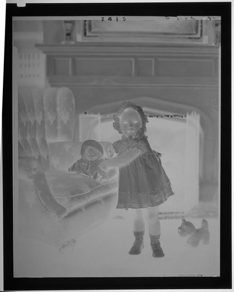 Curator: This image by Lucian and Mary Brown, simply titled "Untitled (little girl jumping on bed with toys)," captures a child's exuberant moment. It's a gelatin silver print, a relatively accessible process for amateur photographers at the time. Editor: The negative print gives it such a haunting, otherworldly feel, doesn't it? It transforms a mundane scene into something almost ethereal. Curator: Precisely! This domestic scene gains resonance when we consider the historical context of photographic production and distribution. The materials and techniques involved speak to a broader democratization of image-making. Editor: And the choice of subject matter! It's fascinating how something as simple as a child's play becomes a window into societal views on childhood and domesticity. Curator: That's right. By examining the labor involved in creating this image, from sourcing materials to darkroom techniques, we gain a richer understanding of its value beyond mere representation. Editor: It leaves you wondering about the role of photography in shaping personal narratives and collective memory, doesn’t it? Curator: Indeed. It's a potent reminder of the multifaceted nature of art and its connection to the material world. Editor: Definitely gives one food for thought.