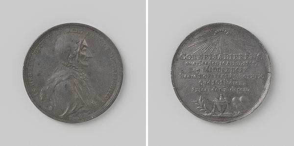 Editor: Here we have "Tweehonderdste verjaardag van de stichting van de hogeschool te Leiden," created in 1775 by Theodorus Victor van Berckel. It appears to be a metal relief, a sort of commemorative coin. The image strikes me as rigidly formal, almost severe in its composition. What do you see in this piece? Curator: Immediately apparent is the work's formal reliance on Neoclassical principles. Consider the crispness of line, the carefully balanced composition, and the allegorical figure presented in profile, echoing ancient Roman coins. How does the inscription, framed by the laurel wreath on the reverse side, impact your understanding of its function? Editor: Well, the inscription gives it a purpose; without it, I might just see a classical scene. With the Latin text, the symmetry and the figure take on the importance of education and history, though I don’t immediately read the Latin, its circular organization around the coin adds to the circular coin composition on the other side. Curator: Precisely. Notice how the artist uses the medium of metal to evoke a sense of permanence and authority, mirroring the institution it commemorates. Observe the treatment of light and shadow; it’s subtle, emphasizing form over overt emotion. It's not mere surface decoration but deeply integral to the composition's conceptual framework. Do you find it effectively conveys the gravitas it seems to strive for? Editor: Yes, the sharpness really drives home that feeling. Thank you; it is so interesting how the formal aspects of the engraving reinforce the purpose. Curator: Indeed. A close look at an object can really reveal its importance and give insights that would otherwise remain obscured.