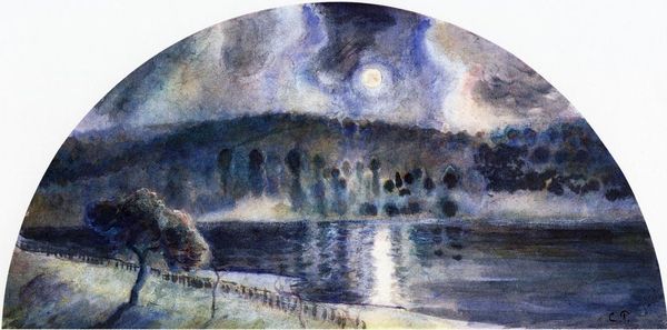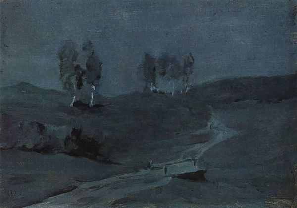 Editor: Here we have David Cox's "Moonlight Landscape" from 1849, executed in watercolor. The dreamy blue hues create an almost unsettling atmosphere. How do you interpret this work? Curator: Cox’s watercolors, like this one, are fascinating because they challenge traditional notions of what "high art" should be. Let’s think about the materiality: he's using watercolor, a medium often associated with sketching and amateur work. What does its use here, do you think, suggest about Cox’s attitude toward the established hierarchy of art materials? Editor: That's interesting. It seems to democratize artmaking, suggesting anyone can create something beautiful, and that beauty can come from humble means. The texture created by the watercolor is really important to the composition too, it feels almost like rough paper. Curator: Exactly! And look closer. Cox wasn’t afraid to experiment with technique, was he? Notice the rapid, almost haphazard brushstrokes, a process driven technique more than descriptive approach. How might the burgeoning Industrial Revolution in 19th-century England have influenced this shift toward process and materiality? Was Cox part of a larger movement? Editor: Perhaps this reflects the shift from hand-crafted to machine-made. This approach may try to embrace a human, albeit imperfect touch? I’m still figuring that aspect out... Curator: Precisely. So, by embracing watercolor and a visibly "hands-on" approach to image-making, Cox is aligning himself with the burgeoning Arts and Crafts movement's appreciation of material and labor, while critiquing the mechanization and mass production gaining traction during that period. Something to keep in mind, right? Editor: It gives me a totally new perspective on what landscape art can be about, not just pretty pictures but comments on broader trends in manufacturing and industry. Curator: Indeed, seeing art as enmeshed in social and material conditions opens exciting avenues for investigation.