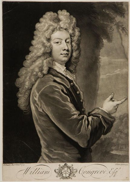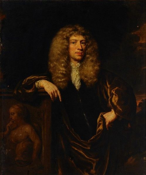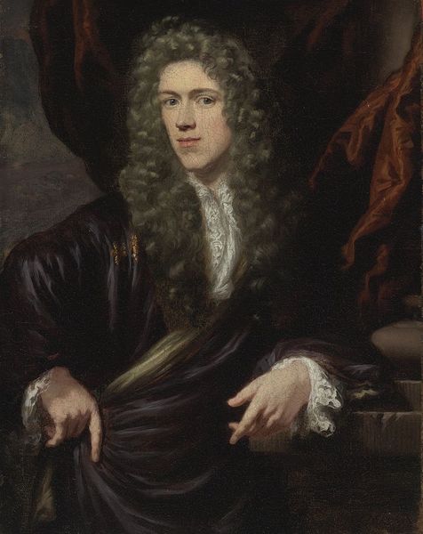 Editor: We're looking at Nicolas de Largillière's "Portrait of Charles-Léonor Aubry, Marquis de Castelnau" from 1701. It’s an oil painting. What immediately strikes me is the sitter's imposing wig. What stories about status and society are woven into this painting? Curator: Indeed, the wig! And the vibrant red robe. This is absolutely about communicating power and status in early 18th-century France. Think about the social function of portraits during this period. Who was commissioning them, and why? Editor: Obviously, the elite could afford to do so, and it seems like the art bolstered their prominence within the social order. Curator: Precisely. The Marquis de Castelnau’s very expensive attire, down to the papers he holds suggesting literacy and probably a connection to the arts or governance. It speaks to the role of art in constructing and perpetuating a particular social hierarchy. Note the idealized background – a romanticized landscape that hints at the sitter’s land ownership and connection to nature. Can we really separate art from propaganda here? Editor: It feels less personal and more like a display of position and affluence. How did Largillière’s artistry support or perhaps subvert the prevailing aristocratic norms? Curator: That's an excellent question. While Largillière clearly caters to his patrons' desires, some art historians argue his skill in capturing the individual's features introduces a certain degree of realism, a hint of humanization beneath the trappings of power. Is he truly capturing an individual, or merely reinforcing a stereotype of nobility? Editor: So, beneath the surface, the artist might be suggesting complexities within the subject's persona? Curator: Precisely! Or, we might see the details as subtle nods to a changing social landscape, where the rising merchant class was beginning to challenge the old aristocracy. This artwork provides an exciting lens into the political and economic dynamics of its time. It highlights the role of visual representation in shaping social perceptions and perpetuating certain power structures. Editor: This has changed how I see the portrait, transforming it from simply decorative into a complex historical document! Curator: Absolutely, seeing portraits like this in the wider political and social environment of their production makes them even more engaging.