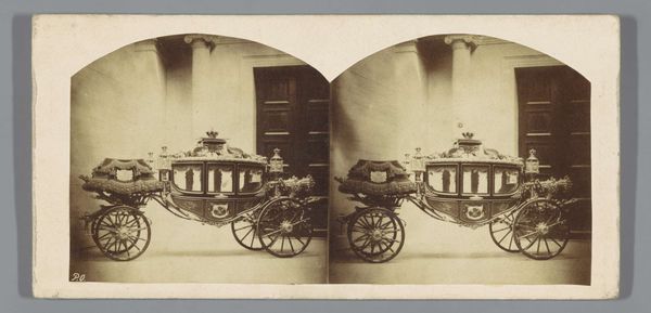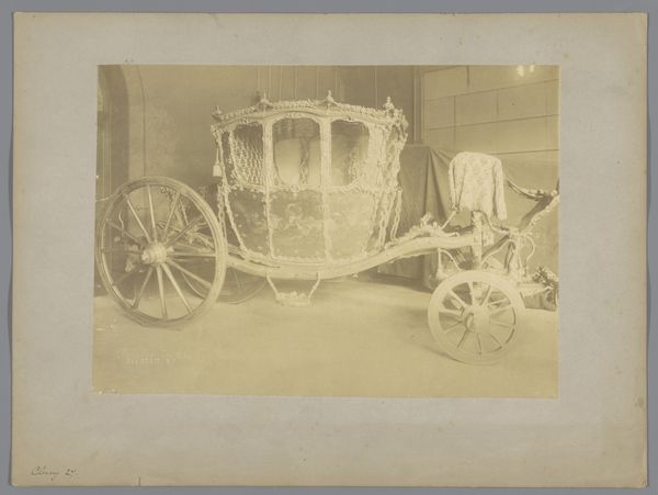 Curator: This albumen print, titled “Koets van Karel X in het Petit Trianon in Versailles,” attributed to an artist only known as “X phot.” and created sometime between 1870 and 1890, immediately strikes me. There’s a subdued elegance, even with such an elaborate subject. Editor: Yes, it feels like faded grandeur. All that ornamentation, yet rendered in sepia tones – it’s almost mournful. One can almost hear echoes of courtly life silenced by history. What statement might we be making, showcasing relics of a monarchy today? Curator: Well, photographs such as this one played a crucial role in shaping public perception of monarchy and power. This one documents a very specific object from a particular political past in a way that invites scrutiny today. In an era grappling with wealth inequality and power imbalances, how do we interpret these relics of opulence? Editor: I find myself particularly drawn to the way the photographer frames the carriage, almost trapping it within the room. It is a static exhibit; what could have symbolized movement, pomp and ceremony is presented as an almost entomological study. The choice to make this an albumen print seems quite deliberate here. Curator: Indeed. Albumen prints, given their popularity in the late 19th century, allowed for wider distribution, almost democratizing the gaze upon these objects, even if access to them in reality was highly restricted. Further, as a technology, photography played a significant role in archiving the material culture of a period, effectively rendering these items subjects to both historical study and judgment. What did the opulence symbolize? For whom did it speak? What realities were concealed by it? Editor: It's fascinating to consider how photography shifted the dynamics between the observer and the observed, especially regarding power. What once might have been a symbol of absolute authority now stands under our collective gaze, ready to be dissected and understood. The still life aspects lend this artwork an eerie tone of finality. Curator: Absolutely. It's not merely a photograph of a carriage; it's a lens through which we examine the construction of power and the evolving relationship between the public and its symbols. That even something intended as active is forced to be still, perhaps the result of larger cultural forces and pressures. Editor: Well, it's given me a lot to think about in terms of what "genre painting" really means and I like thinking about how an old medium and photographic style is actually suited well for critiquing ideas about inherited wealth.