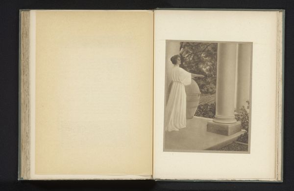 Editor: This gelatin-silver print, "Vrouw zittend op een muur met uitgestrekte armen" or "Woman sitting on a wall with outstretched arms," by Adelaide Hanscom Leeson, likely made before 1916, has a certain serenity to it. What jumps out at you? Curator: Well, the processes inherent in Pictorialism are central. This isn't a mere snapshot. Consider the labor involved: the artist manipulates the gelatin-silver print to achieve that soft, dreamlike quality. The very act of constructing this image departs from simply capturing a scene, bringing in Symbolist ideas. How does that pre-WWI cultural moment inform the aesthetic? Editor: It’s interesting to think about the physical work that went into making the image, beyond just taking the photograph. I guess it gives it a kind of handcrafted feel, elevating it beyond mass-produced imagery. Curator: Exactly! And that connects it to the Arts and Crafts movement’s emphasis on handcraftsmanship. The aesthetic becomes a social statement. Leeson consciously used photography to emulate painting and printmaking techniques. Can you see traces of that? Editor: I do, especially in the way the light is diffused. It’s almost painterly. So the artistic value wasn't just in the subject matter, but also in the material process itself? Curator: Precisely. And that's crucial. We often forget that the making informs the meaning. Think about what the subject matter and artistic treatment is implying about this female figure's status within her social sphere. What possibilities could a turn-of-the-century woman realistically aspire to? Editor: So, by carefully controlling the materials and process, Leeson elevated photography to fine art and commented on female status? I never thought about photography this way. Curator: That’s the power of the materialist perspective; it reframes how we perceive art and its cultural context. Hopefully, that will open up how you analyze many other images you study from now on.