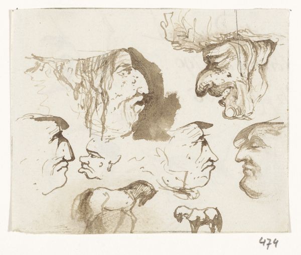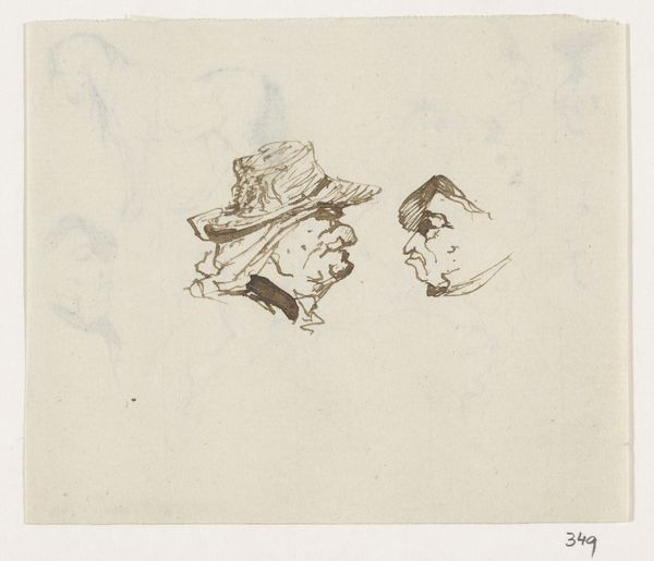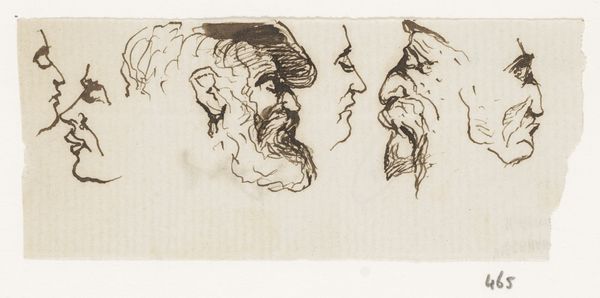 Editor: Here we have "Drie Koppen," or "Three Heads," an ink drawing by Johannes Tavenraat, created in 1869. The piece presents three characterful faces in profile, rendered with swift, expressive lines. There's something quite theatrical about them. What do you make of their distinct features and arrangements? Curator: What strikes me immediately is how these sketches function almost as physiognomic studies, recalling the 18th and 19th century fascination with reading character from facial features. Consider the exaggerated noses, the deep-set eyes, and the resolute chins; each feature seems to amplify a specific personality type. Doesn't it feel as though Tavenraat is not merely depicting faces, but rather archetypes of human nature? Editor: That's an interesting perspective. It gives a sense of this work capturing collective memory through those facial symbols. They appear timeless, in a way. So you are seeing them not just as portraits but perhaps character studies, maybe even stereotypes, represented through persistent visual tropes? Curator: Exactly! Notice how the immediacy of the ink sketch paradoxically enhances this effect. The fleeting quality captures the essence of these ‘types’ without committing to individual likeness. Do you sense how Tavenraat harnesses a kind of shorthand, drawing on cultural memory, to instantly evoke distinct personalities and social roles? Editor: Yes, it's as though he's tapped into some pre-existing visual language. The more I look, the more symbolic those features seem. This lens brings an entirely different level of cultural history that I was initially unaware of. Curator: Indeed. By focusing on symbolic facial representation, we see "Three Heads" becoming more than just a study of faces, it is a window into a whole history of how character, class and even prejudice was inscribed upon the human form through art and visual culture. Editor: That's really shifted how I understand this piece! Now, seeing this work with an awareness of its historical context makes the sketch speak more loudly than I had expected.