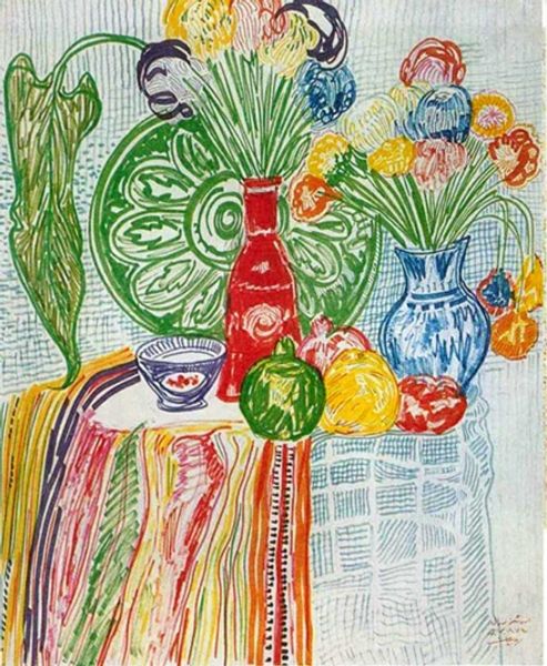 Curator: Here we have Radi Nedelchev’s "Still Life with Red Apples," an oil on canvas painted in 1967. What’s your immediate take on it? Editor: Oh, it’s lovely. Endearing, almost child-like in its exuberance. Like a memory of someone’s grandmother’s kitchen, all colors and folk charm, maybe with a dash of melancholy thrown in. Curator: Melancholy? Tell me more. I read it as celebratory, this abundance of domestic objects, alluding to the post-war consumer culture. Editor: Maybe "melancholy" is too strong. More like a whisper of time passing, seen in the slightly faded colors. The patterned vases and that bowl of red apples have this nostalgic aura, a hint of simpler days—idealized, perhaps? Curator: It’s worth remembering that socialist realism, while dominant, didn't fully erase the drive toward individual expression. Nedelchev uses the still life—historically associated with bourgeois comfort—to explore his folk-art roots within this tension. The flowers, the patterned ceramics... they all speak to a specifically Bulgarian visual language. Editor: And those vibrant patterns jump out, don’t they? Each one feels deliberately chosen, from the checkered cloth to the motifs on the vases. They fight against that melancholy—a sort of vibrant assertion of life. You mentioned socialist realism; do you think this painting offers an alternative to the dominant themes of the time? Curator: Definitely. By focusing on the intimate sphere and drawing inspiration from folk traditions, Nedelchev quietly resisted the grand narratives imposed by the state. It champions everyday life and elevates the artistry inherent in ordinary objects. Editor: It also makes me think of folk art in relation to class and gender. Aren’t those so often gendered spaces? And related to questions of cultural capital? There’s something powerful in asserting the aesthetic value of what's often devalued, don't you think? Curator: Precisely! That interplay is absolutely critical. It elevates craft, traditionally marginalized within the art world, into the realm of high art. Editor: Hmm. This painting certainly leaves an aftertaste of coziness. It has inspired me to make apple crumble this weekend, for sure! Curator: And for me, it re-emphasizes art’s capacity to weave threads of personal and cultural identity into our present understanding.