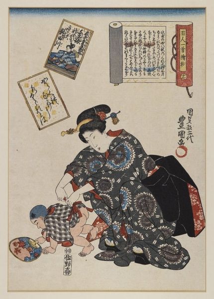 Curator: We’re looking at "Servants’ Quarrel," a 19th-century woodblock print by Utagawa Hiroshige. Editor: It’s... chaotic. Visually, a flurry of frantic movement, almost a spiral of limbs and swirling robes rendered in a muted yet vibrant palette. It makes you feel unsettled. Curator: Yes, Hiroshige presents a humorous take on social tensions, the chaotic disputes among domestic staff were popular subject at that time. See how their agitation relates to established class norms through art? Editor: There's a naive quality to the execution. The perspective is flattened, almost nonexistent, which throws all the figures forward, intensifying the sense of pandemonium. The artist’s composition choices amplify chaos. Curator: Indeed. Note the symbolism inherent in their gestures, stances. The implements, the broom, the bamboo pole--common household objects repurposed as weapons of class struggle. The artist satirizes societal divisions with sharp and pointed social commentary. Editor: Look at the expressive linework, each stroke defining form, outlining fabric folds. The colors, muted indigos, earthy reds, seem both restrained and energized by the frenzied composition. A strange dissonance. Curator: Ukiyo-e prints like this served as mirrors of everyday life. They democratized art, made commentary available to all echelons of society, even in relation to gender or occupation. Here is visual language of everyday disagreements. Editor: While appreciating the commentary of class norms of the print medium in 19th century Japan, the emotional intensity still leaps out for me: the way the women’s frantic movement creates a feeling of disruption, chaos, and unease. Curator: Precisely, and it brings a very valuable approach and perspective in comprehending Japanese social dynamics to those who may be separated from the work by both temporal distance and cultural difference. Editor: Ultimately, I can't deny how the forms in 'Servants' Quarrel,' chaotic as they are, evoke this timeless frenzy within interpersonal relationships— it feels immediate.