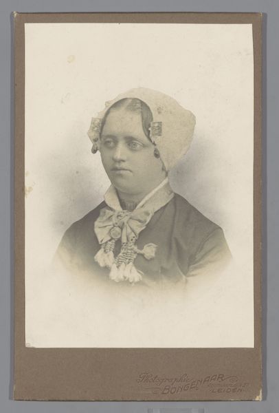 Curator: Before us we have a portrait, circa 1865, attributed to Johannes Baer. It is titled "Portret van een vrouw" and uses the daguerreotype technique of early photography. What's your initial impression? Editor: My initial feeling is somber elegance. The tonality creates a sense of subdued refinement, but what draws me in is the almost sculptural quality of the sitter’s face and the delicate use of light. Curator: I agree, there’s a definite artistry in the distribution of light, highlighting her features with remarkable clarity for the period. Notice how the tonality is achieved through chemical reactions of silver iodide rather than, say, manipulated darkroom methods. It represents a unique form of material production. Editor: Exactly! And you can tell much about the studio practice from this material investigation: the glass plate preparation, the precision needed for coating, and how atmospheric conditions may have played a role in the final image quality. Even the mounting has significance – indicating standardization across many cartes-de-visite printed in the period. Curator: An important point. Focusing on her adornment: the intricate floral headpiece, her delicately buttoned blouse and ribbon choker… what visual signifiers can we draw from those? How does this create a narrative? Editor: I interpret these adornments as signs of social standing. Each detail is precisely placed; communicating refinement as part of a conscious self-representation within very strict codes. Consider that these are manually created details and mass produced – that changes how we read what they are meant to signify. Curator: This process – going from the photographic print to a sort of mass produced image that many people had access to is remarkable! Editor: It absolutely is. Studying its material creation methods illuminates the social context behind such artifacts of our past. Curator: Indeed, understanding the mechanics and artistry helps us unravel social meanings held within images such as this. Editor: Absolutely, and in considering process and the people behind that process, perhaps this seemingly formal portrait provides a mirror for deeper investigation of human social history.