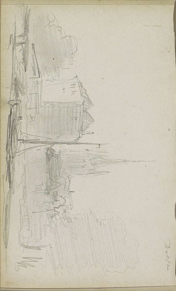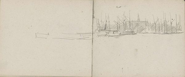 Curator: Here we have Louis Apol’s "View of the Port of Vardø," likely created sometime between 1880 and 1887. The artwork, held here at the Rijksmuseum, is a drawing on paper. Editor: It’s all charcoal greys, shimmering almost like mist. I'm struck by how he uses just a few lines to suggest a bustling harbor scene, shrouded in a hazy atmosphere. Curator: Absolutely. The sketch provides a glimpse into the fishing industry that was prevalent in the area and its social and material implications. It likely reflects the increasing industrialisation of the North Sea fishing industry and its connection with coastal communities. Editor: And the way the lines of the ships mirror those of the buildings along the shore is just fascinating. It shows a deep understanding of structure and form. Apol captures the very essence of the scene using these very subtle strokes. It makes me want to contemplate line weight and shading. Curator: I agree. We have to recognize how drawings like these document labour history of sailors and fisherman, in that part of Norway, at this time. Vardø served as a strategic place, and its people have been known to fish some of the most unforgiving waters in the world. Apol likely drew some quick sketches of them doing this important job. Editor: Fascinating point. He uses an Impressionist style which lends itself to capturing transient atmospheric effects. There is little colour, yet the interplay of light and shadow imbues the image with so much character. Curator: And we can see this technique employed by the artist when dealing with these industrial spaces, that were inhabited and maintained by so many nameless men and women, whose contribution may remain obscure if it was not through works of art such as these, works that display fishing as hard work that requires endurance and resistance. Editor: It does give us an image into the harsh conditions of their labours. Ultimately it goes back to Apol's masterful handling of shape and form that creates this haunting image. Curator: Yes, it’s an intersection of aesthetics and socio-economic conditions that make this sketch worthy of closer observation and critical understanding. Editor: A successful intersection of these factors by Louis Apol.